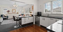 The compact kitchen looks through to a spacious open plan dining/lounge with ranch slider access to a flat, easy to manage lawn & garden.
