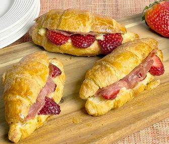 Preheat the oven to 170°C. Or preheat an air fryer. Fill each croissant with the grated mozzarella, salami, a dash of mustard and the sliced strawberries.