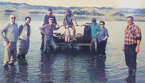 Toddler Kelly Dockery stands in front of her parents Ross and Janine atop the first ever “mussel barge” on Aotea Harbour with mussel pioneer Dave Morrison, extreme left, unknown scientists and to the right her late grandparents Edith and Reg Dockery and Kaiaua mussel farmer Mark Aislabie.