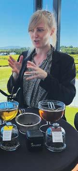 Zealong Estate’s Julia Jeanplong, left, with samples of the estate’s tea with the plantation behind her looking north. Waikato Sunrise inventor Annalyn Walen creates her cocktail for guests. Photos: Mary Anne Gill