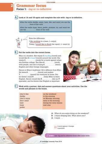 Put the verbs into the correct forms. Miyu is a student. She enjoys 1 traveling (travel) and would like 2 to travel (travel) around the world. She wants 3 (work) for a travel agency when she finishes college. She likes 4 (work) with people, and she is trying 5 (learn) English and other foreign languages. Haruto is Miyu’s boyfriend. He’s different from Miyu. (travel) and prefers He hates 6 7 (spend) his vacations at home. But he doesn’t mind 8 (help) Miyu to learn English. Haruto would like 9 (be) an IT specialist, and he knows that English is important.