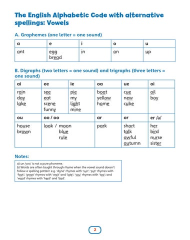 Notes: a) ue /yoo/ is not a pure phoneme. b) Words are often taught through rhyme when the vowel sound doesn’t follow a spelling pattern e.g. ‘done’ rhymes with ‘sun’; ‘put’ rhymes with ‘foot’; ‘great’ rhymes with ‘wait’ and ‘late’; ‘you’ rhymes with ‘too’; and ‘word’ rhymes with ‘herd’ and ‘bird’.