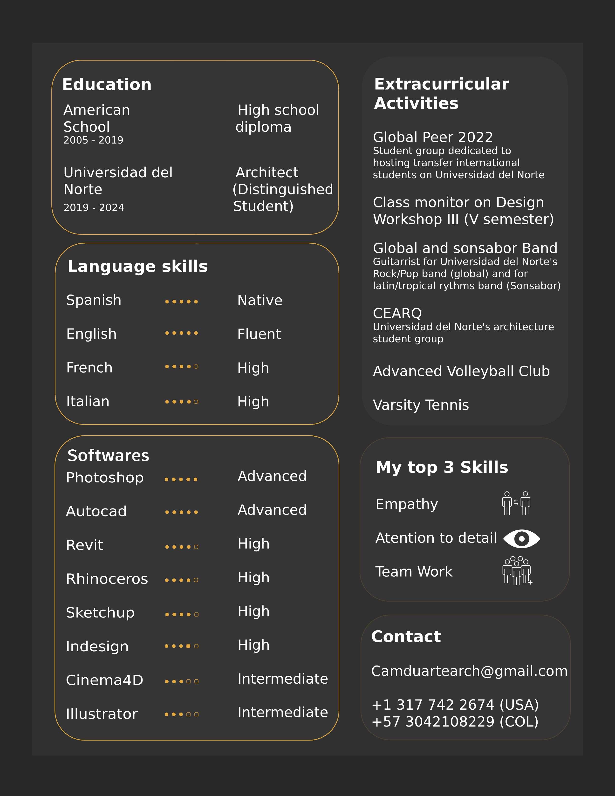 I started my architecture career by going to Unviersidad del Norte, Ranked as one of the top universities in Colombia, and after the succesful completion of all the courses during all the years, mantaining a GPA of over 4.2/5 and getting the title “distinguished student every year, I got my architecture bachelors degree.