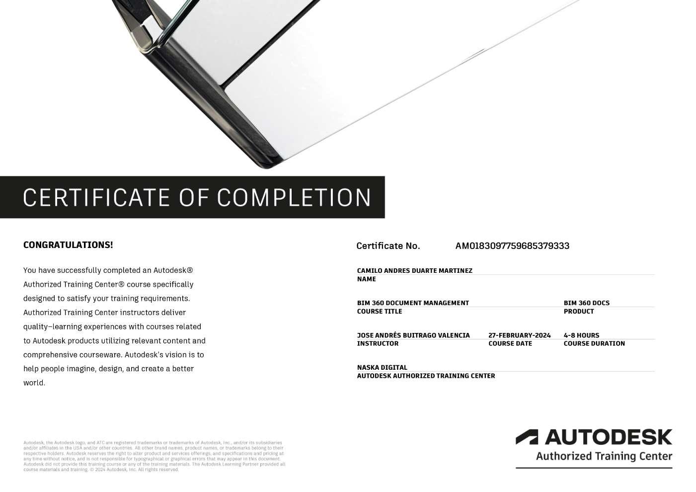 After the succesful completion of the certificate course, Autodesk certifies that I have the competences on the following fields: Revit Bim modeler and architectural design, BIM 360 and Naviswork.