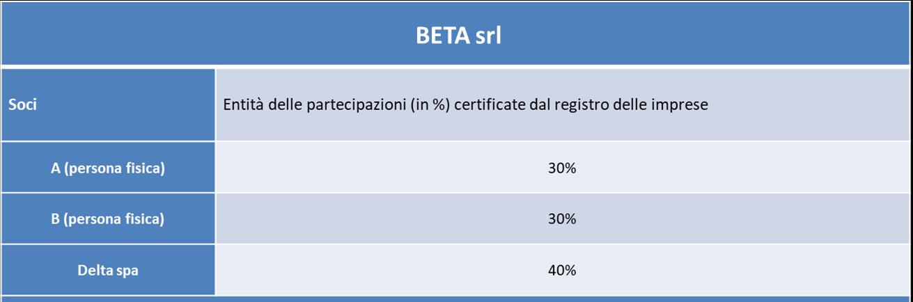 Utilizzando questo criterio i titolari effettivi di Beta sono i soci A e B con requisito TPD (partecipazione proprietaria diretta superiore al 25% del capitale) e X con requisito TPI (partecipazione proprietaria indiretta superiore al 25% del capitale).