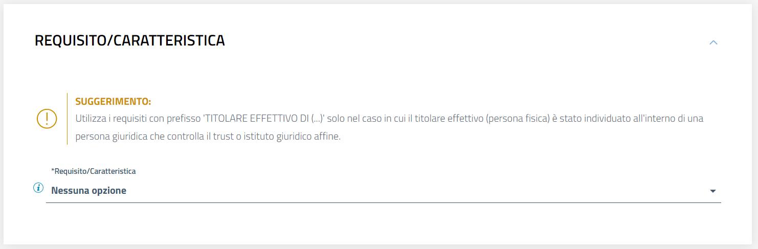 44 Menu a tendina con i requisiti/caratteristiche del titolare effettivo REQUISITI/CARATTERISTICHE