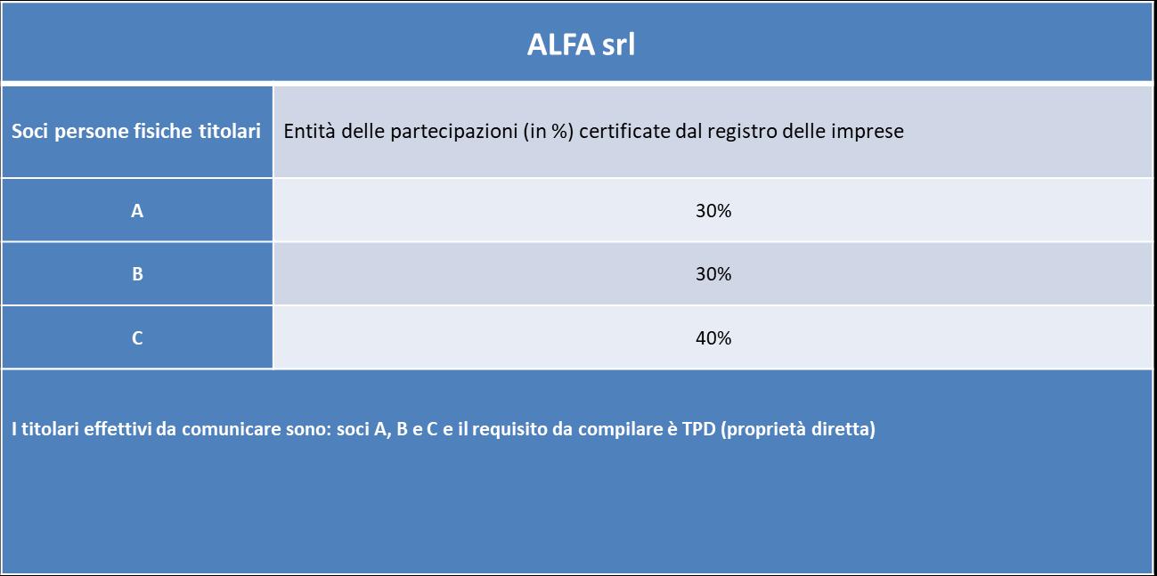 I titolari effettivi da comunicare sono: soci A, B e C e il requisito da compilare è TPD (partecipazione proprietaria diretta superiore al 25% del capitale)