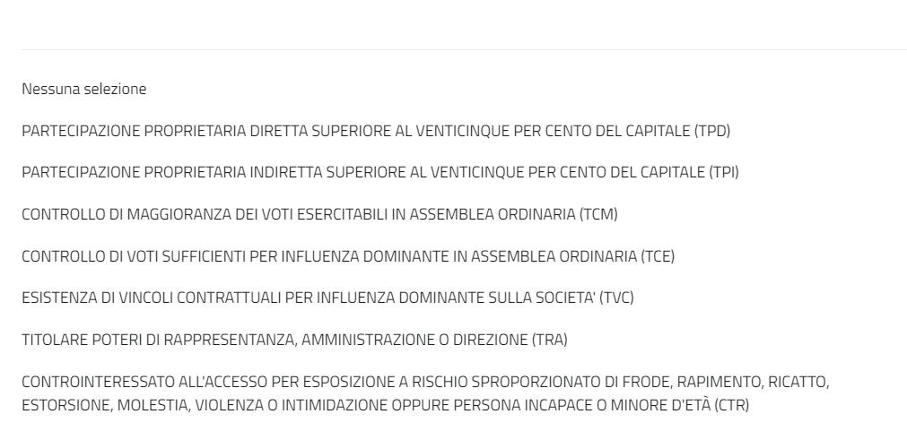 37 Menu a tendina con i requisiti/caratteristiche del titolare effettivo REQUISITI/CARATTERISTICHE