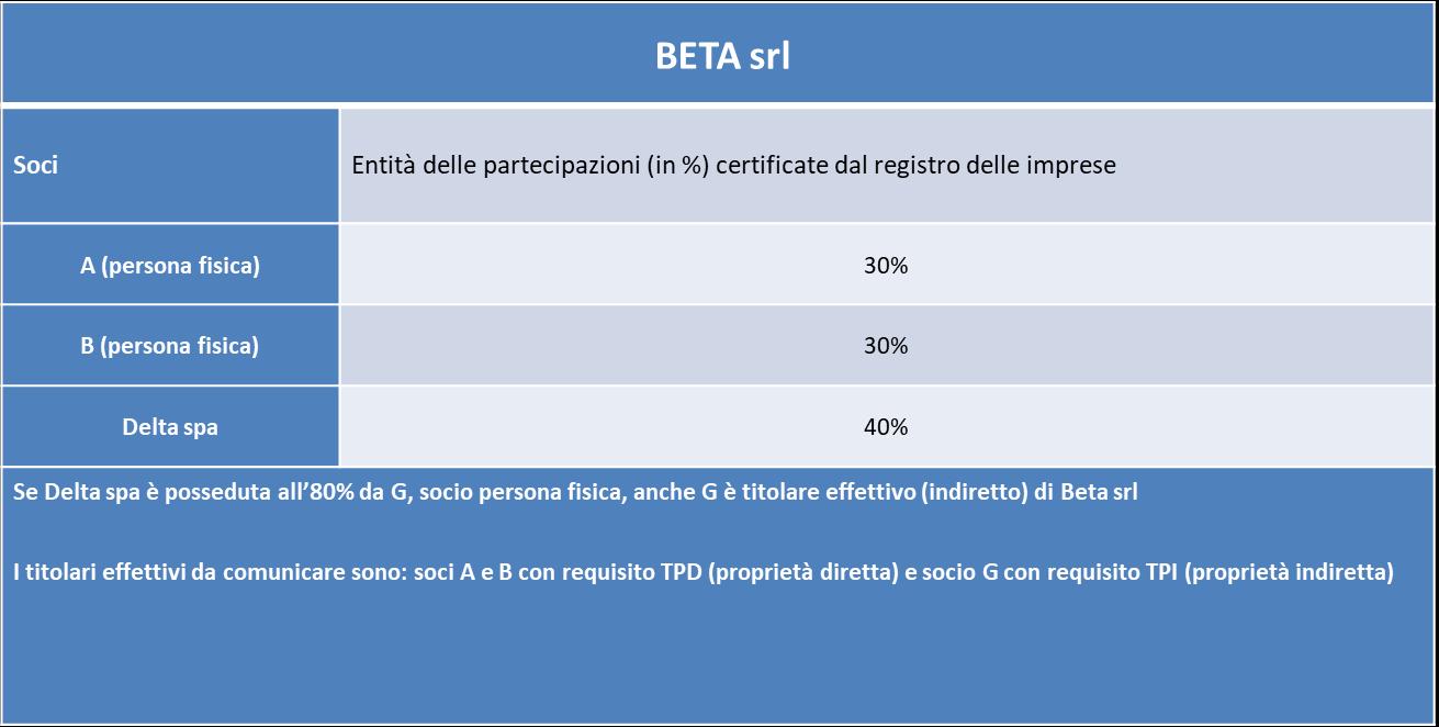 La presenza, nella compagine sociale, di una società con partecipazione sopra-soglia impone la ricerca delle persone fisiche che, a monte e quindi tramite Delta spa, siano individuabili come titolari effettivi indiretti di Beta srl.