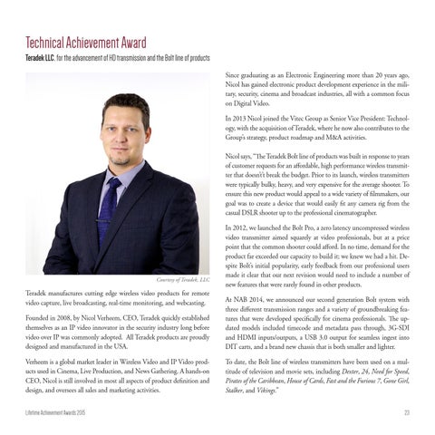 Technical Achievement Award Teradek LLC, for the advancement of HD transmission and the Bolt line of products Since graduating as an Electronic Engineering more than 20 years ago, Nicol has gained electronic product development experience in the military, security, cinema and broadcast industries, all with a common focus on Digital Video. In 2013 Nicol joined the Vitec Group as Senior Vice President: Technology, with the acquisition of Teradek, where he now also contributes to the Group’s strategy, product roadmap and M&A activities. Nicol says, “The Teradek Bolt line of products was built in response to years of customer requests for an affordable, high performance wireless transmitter that doesn’t’t break the budget. Prior to its launch, wireless transmitters were typically bulky, heavy, and very expensive for the average shooter. To ensure this new product would appeal to a wide variety of filmmakers, our goal was to create a device that would easily fit any camera rig from the casual DSLR shooter up to the professional cinematographer.