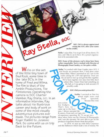 W e're on the set of the little tiny town of Bed Rock, some time in the late BC's, in the home of Fred and Wilma. The film is that of the Amblin Productions, The Flintstones. Operating the camera is SOC Charter Member, Ray Stella, soc. In an informative interview, Ray talks about his illustrious career and body of work on some of the most visually adventurous pictures ever made. The pictures range from Roger Rabbit to Jurassic Park. So come with us on trip Back to the Future.