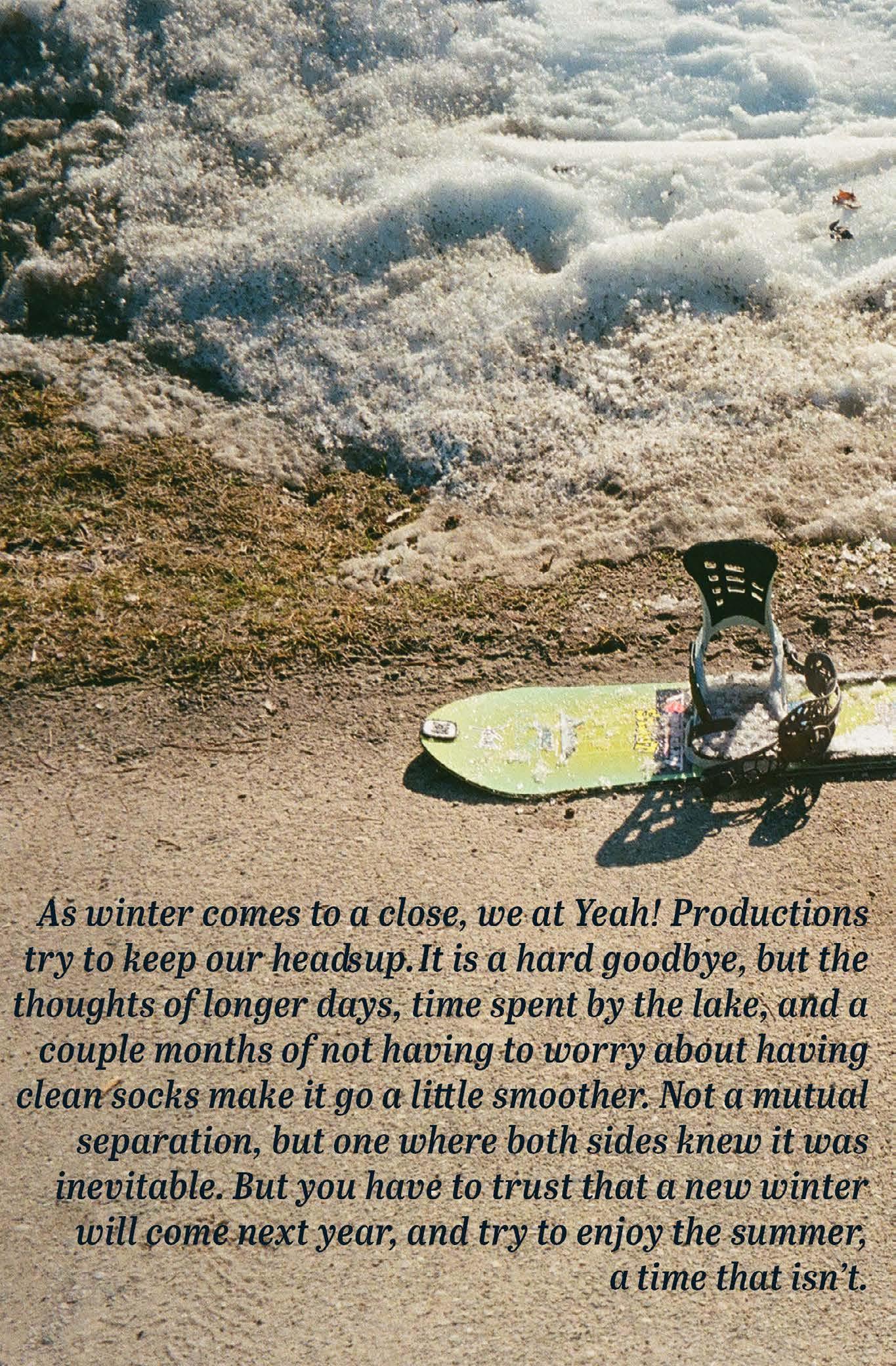 As winter comes to a close, we at Yeah! Productions try to keep our heads up. It is a hard goodbye, but the thoughts of longer days, time spent by the lake, and a couple of months of not having to worry about having clean socks make it go a little smoother. Not a mutual separation, but one where both sides knew it was inevitable. But you have to trust that a new winter will come next year, and try to enjoy the summer, a time that isn’t.