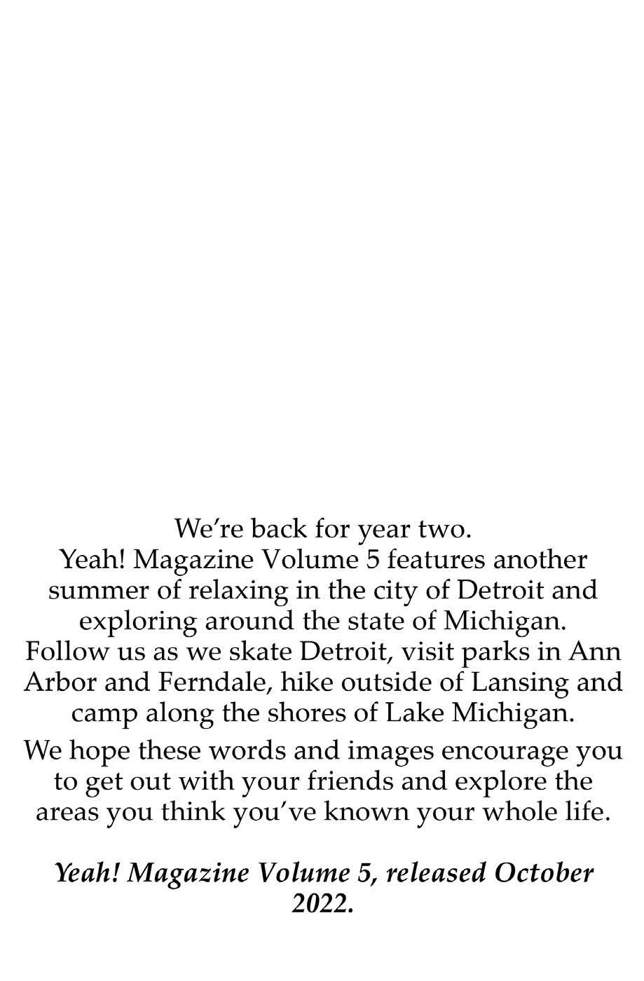We’re back for year two. Yeah! Magazine Volume 5 features another summer of relaxing in the city of Detroit and exploring the state of Michigan. Follow us as we skate Detroit, visit parks in Ann Arbor and Ferndale, hike outside of Lansing, and camp along the shores of Lake Michigan. We hope these words and images encourage you to get out with your friends and explore the areas you think you’ve known your whole life.