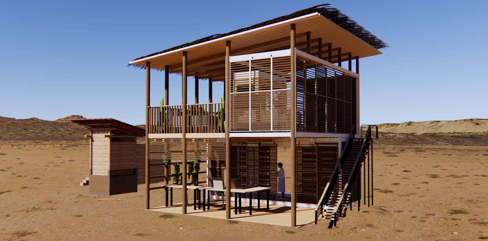 Proyecto propuesto para el confort de un centro de investigación para un biólogo marino y botánico en Illescas, Perú. Se realizó una investigación de la zona y su clima para desarrollar una propuesta de diseño sostenible. Cuenta con un techo inclinado con paneles solares direccionado hacia el norte para aprovechar la mayor cantidad de rayos solares. Sepropusoelmolinoparagenerarenergíaeólica(vientoprovenientedelsurysureste). Se utilizó el baño seco debido a que la zona no cuenta con gran ingreso de agua o desagüe. Además, se incentiva el ahorro de agua y se obtendrá una forma de hacer compost para cultivos o reforestamiento.Se implementó puertas corredizas a base de bambú para controlar el ingreso de luz solar y controlar el paso del viento