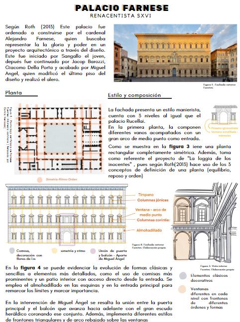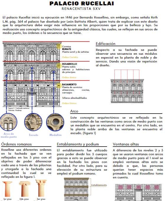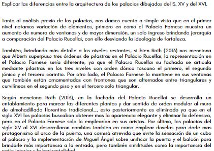 Se encargó dibujar, ya sea a mano ya sea a través de otros dibujos, pero retocados con sus explicaciones, la fachada y la planta de un palacio renacentista florentino del S. XV y otro romano o florentino del S. XVI. Podrá también po ner detalles arquitectónicos. Debe señalar la ciudad en que se ubica, fecha de ejecución, el arquitecto que lo realiza, como se refleja su pensamiento arquitectónico en la cons trucción, las influencias que pudo tener de otro arquitecto, estilo arquitectónico, u edificio y características formales arquitectónicas y estructurales, etc., del mismo. También, explicará las diferencias entre la arquitectura de los palacios dibujados del S. XV y del XVI . Para ello debe tener en cuenta las lecturas subidas en el Aula Virtual de clase.