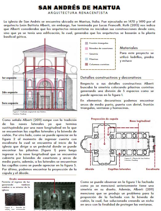 El alumno deberá analizar la arquitectura renacentista de León Battista Alberti, siglo XV y la de Donato Bramante, (paso del S. XV al XVI). Para ello, elijará 2 edificios, uno de Alberti de planta longitudinal, San Andrés de Mantua (1462-1494) y para Donato Bramante la construcción de planta centralizada del Templete de San Pietro in Montorio Analizarán ambas construcciones primero comentando la genialidad de ambos arquitectos en estos nuevos diseños arquitectónicos, como cada uno cambia la arquitectura que se estaba haciendo en su época por el “nuevo” estilo, cua les son sus referentes arquitectónicos y cuáles los teóricos de ambos y como los aplican en su arquitectura que deben analizar. Comenten en el caso de Alberti como aplica sus teorías arquitectónicas (como teórico con su “ re aedifica toria” ) aplicadas en la iglesia de San Andrés de Mantua y en Bramante en San Pietro in Montorio. Comenten también la elección de ambos sitios, qué había antes, cual es la geniali dad del arquitecto en aplicar sus teorías en cada edificación. Después, con dibujos de las plantas, fachadas, alzados y de talles constructivos, comenten las características anteriores (influencias griegas, romanas y nuevas aplicaciones en la arquitectura de ambos arquitectos)