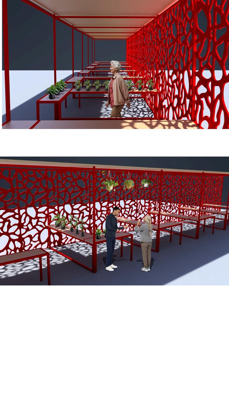 "Cadapabellónestácompuestopor7módulosde 3x3metros,loquedacomoresultadouna longitudtotalde21metrosporpabellón.La propuestaparaelParqueBrasilcontemplala instalaciónde4pabellones,dispuestosendos filasenfrentadas.Estaconfiguraciónhasido pensadaestratégicamenteparapermitir,en casodesernecesario,laincorporacióndemás pabellonesenlaplazasinqueelloimplique problemasdeespacioocirculación "