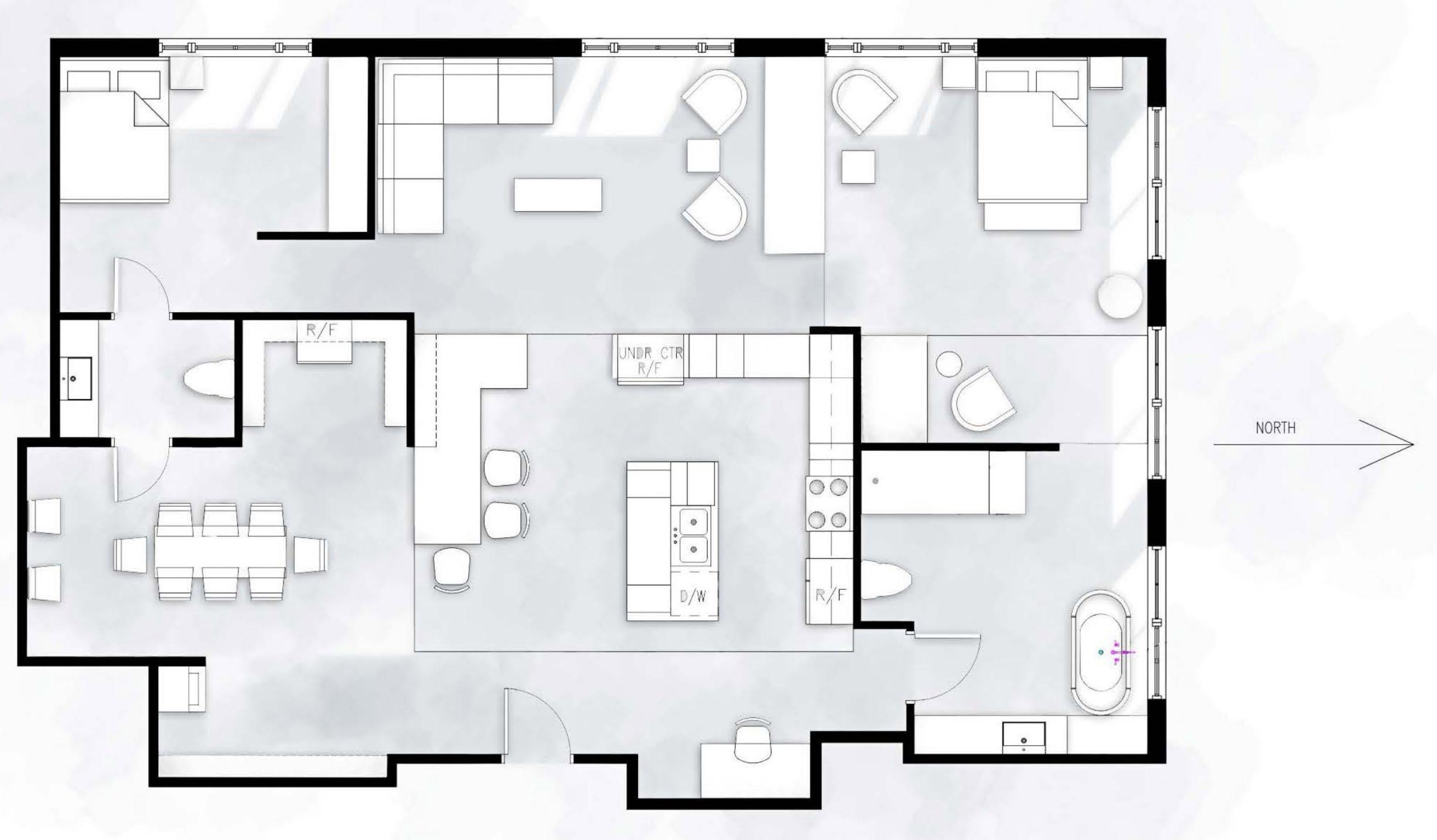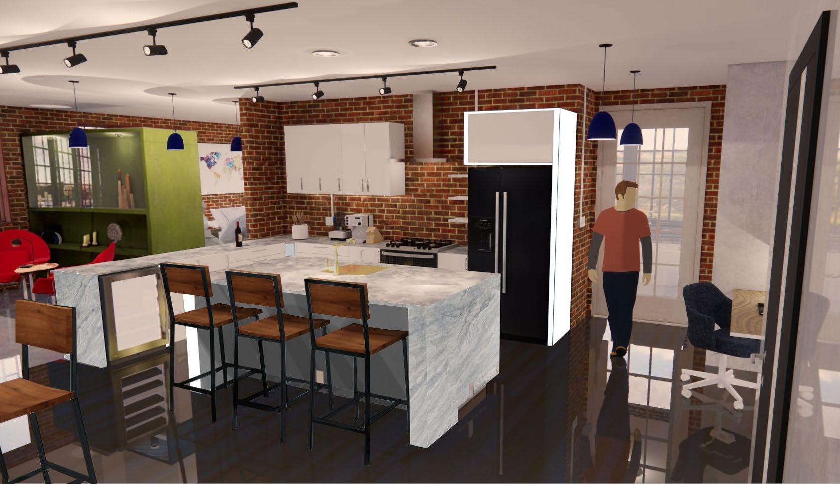 Execution: This remodel boasts a plan exploring a flexible open concept inspired by the Edith Farnsworth home, with the kitchen being the central landing spot for all guests and the resident in question, to receive all incoming foot traffic and disperse accordingly - with ease of access for the host and her guests to their respective quarters, restroom facilities, closet and lounge space all within arms reach, with ease of separation for private spaces including restroom and bath facilites, particularly for the host and resident of the space.