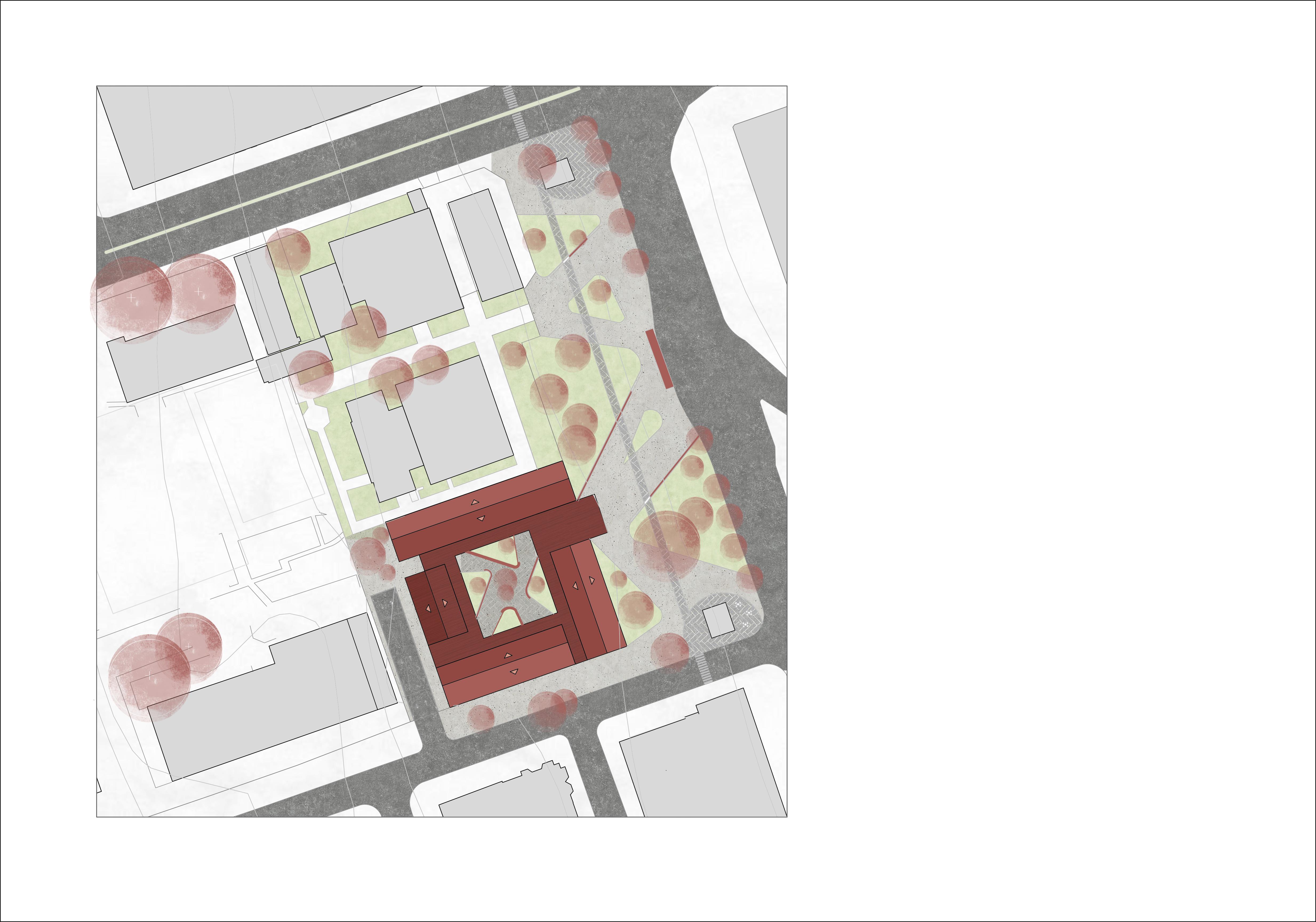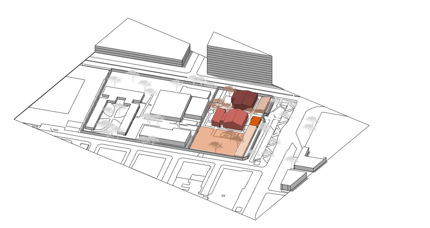 A partir da necessidade de construir um volume em que os setores do centro cultural pudessem ter conexão entre si, garantir o contato dos visitantes com a arborização interna e permitir uma circulação confortável entre os espaços que foi proposta uma volumetria com pátio interno central e fachadas valorizando a conexão com as ruas e avenidas próximas, locais de circulação e chegada para os visitantes. O programa dessa forma foi otimizado, com dimensões mais coerentes com a escala do centro cultural.