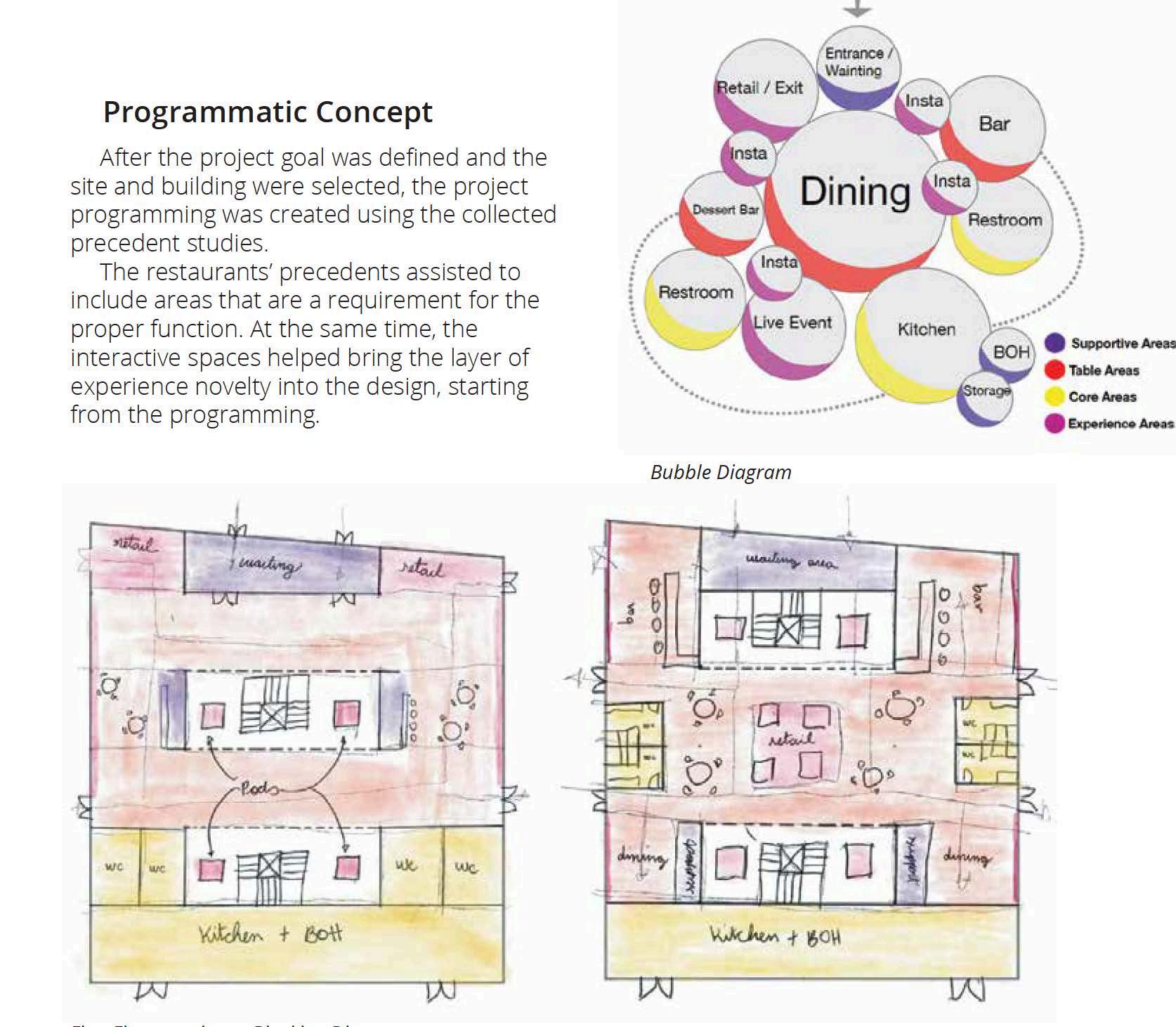 The restaurants’ precedents assisted to include areas that are a requirement for the proper function. At the same time, the interactive spaces helped bring the layer of experience novelty into the design, starting from the programming.