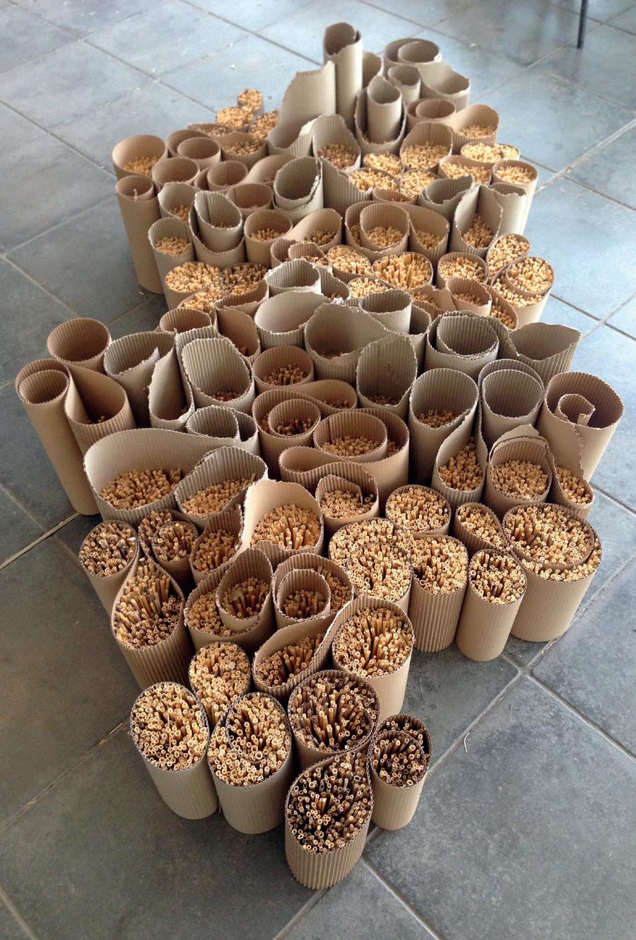 Clairement défini lorsqu’il est isolé, le module de carton ondulé se perd parmi ses congénères juxtaposés au sol. Les cannisses, tous coupés à la même hauteur, viennent combler tous les vides ainsi formés et définissent un plan horizontal. Les modules quant à eux sont de différentes tailles font ainsi moduler la hauteur. La modulation se fait douce avec les déchirure en opposition à la surface rugueuse de ce nuage de points juxtaposés. Les corps des visiteurs viennent ainsi surplomber cet ensemble, ne dépassant pas les 40 cm de haut. Le tout se déploie sans limite clairement arrêtée.