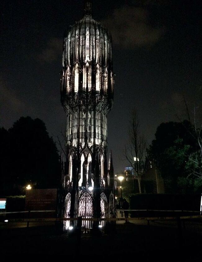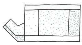 L’objet est posé horizontalement sur le site en pente créant un porte-à-faux. Cette disposition met en évidence un vide et nourrit l’impression d’une coulée, créée à partir d’objets en métal rouillé, amassés à une des extrémités du contenant.