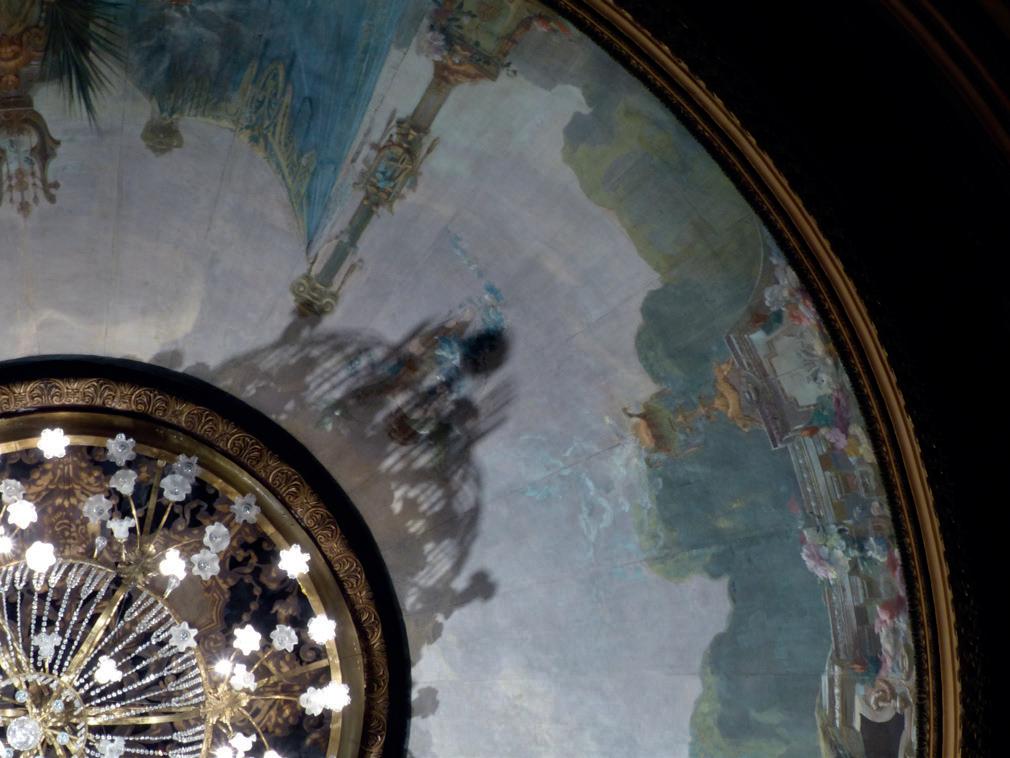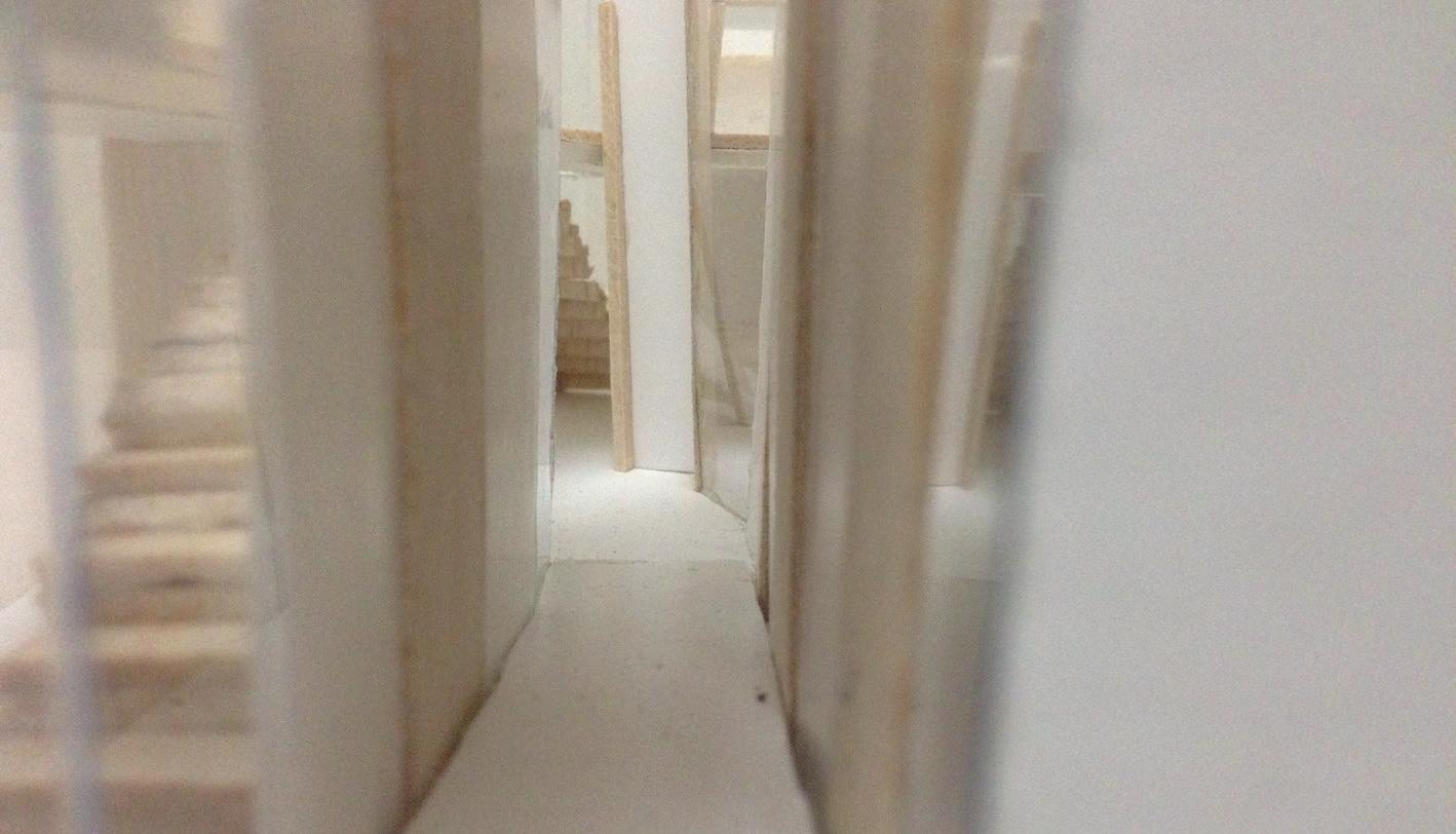 Le parcours est rythmé par des panneaux verticaux, de bois, plâtre ou verre, et par des abaissement du plafond, aspirant le promeneur.