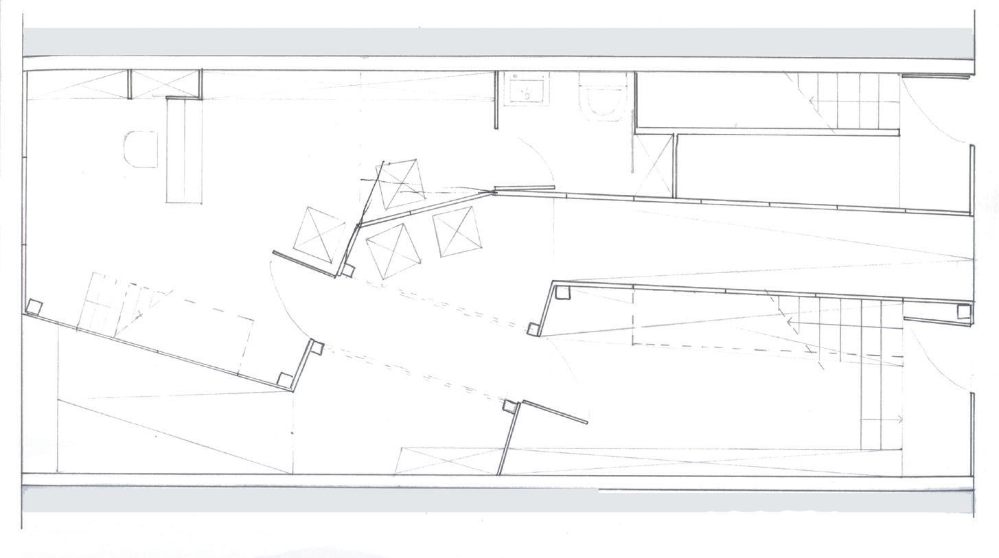 Le vide ainsi dégagé se déploie sur la hauteur et de nouveaux espaces intérieurs le ponctue de manière presque aléatoire. L’ensemble crée une multitude d’interstices entre cette clôture verticale et ces pièces qui s’entremêlent sur plusieurs niveaux.
