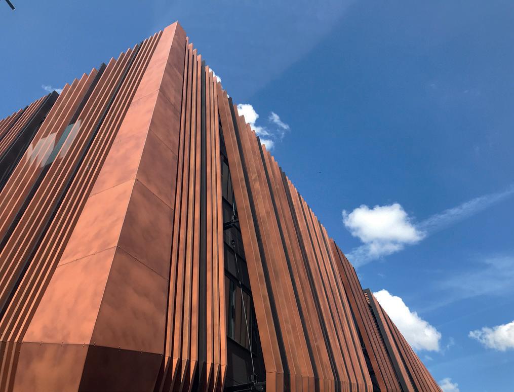 Le bâtiment se veut moderne et performant. Les façades et compositions de murs s’encrent profondément dans la démarche bim et hqe. Il s’agit ici d’un cube noir devant lequel se développe la résille de lames métalliques laquées. Poteaux-poutres et dalles bétons s’allient aux murs en ossatures bois.