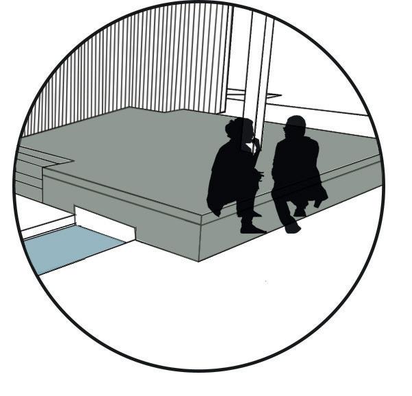 Des boîtes de bois contiennent l’intégralité du programme nécessaire à la bonne organisation des spectacles, tel que les loges ou les sanitaires. Leur disposition délimite un large espace qui peut autant servir aux répétitions qu’à l’accueil des spectateurs.