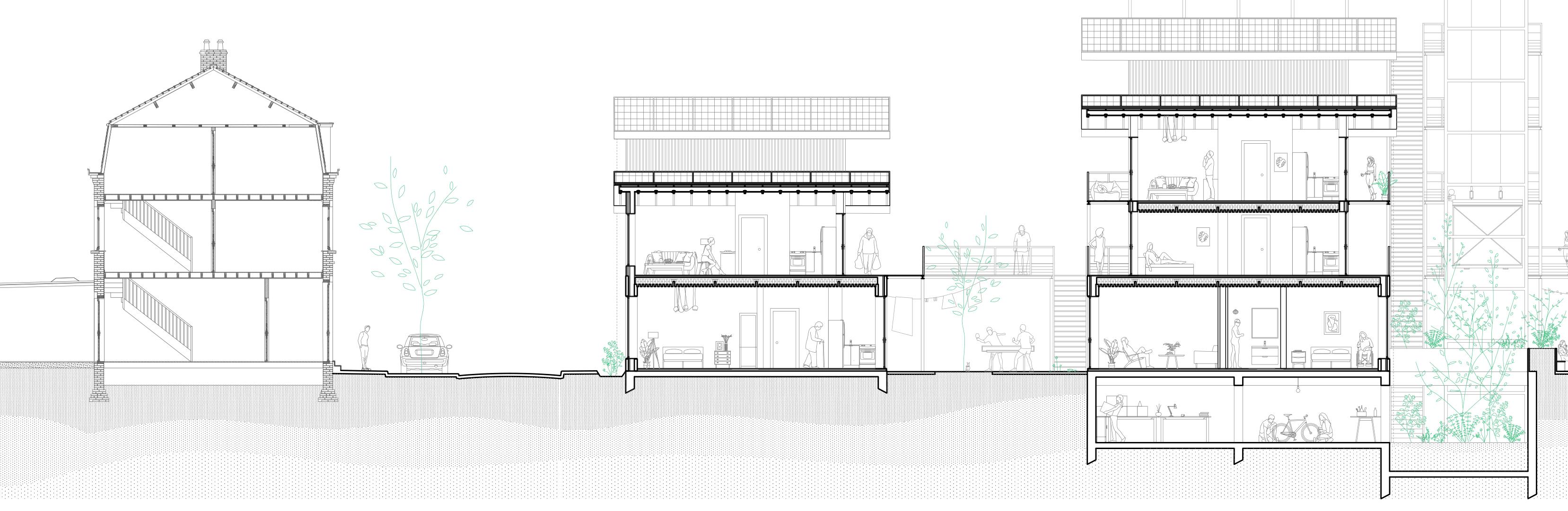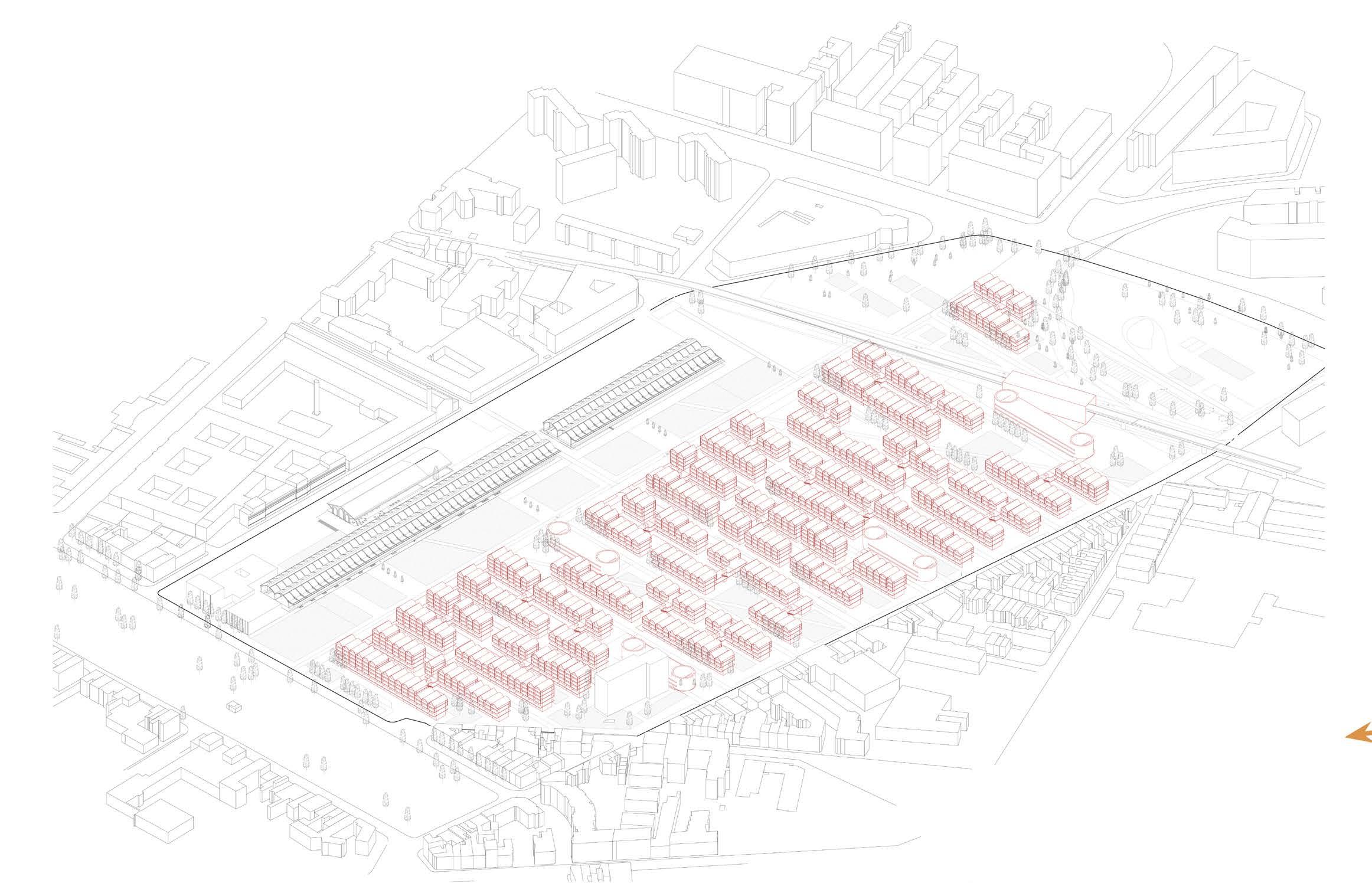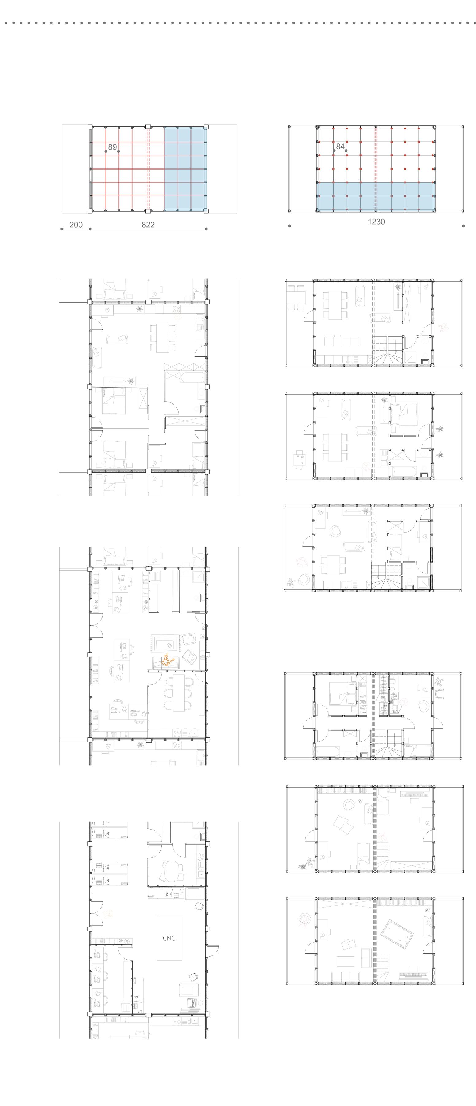 housing in a neighborhood undergoing renewal. We based ourselves on what will be built in the future but in a «Habiter2030» approach we decided to propose a counter-project. Thus, we have established a method of a house that can be self-built by its inhabitants. Placed on concrete bases (made by professionals), we give the future inhabitants the possibility to go to the workshop near the hall to start learning and building their own house, which can go up to 3 stories. The notions of playfulness and economy fed the method to make it a real operating mode.