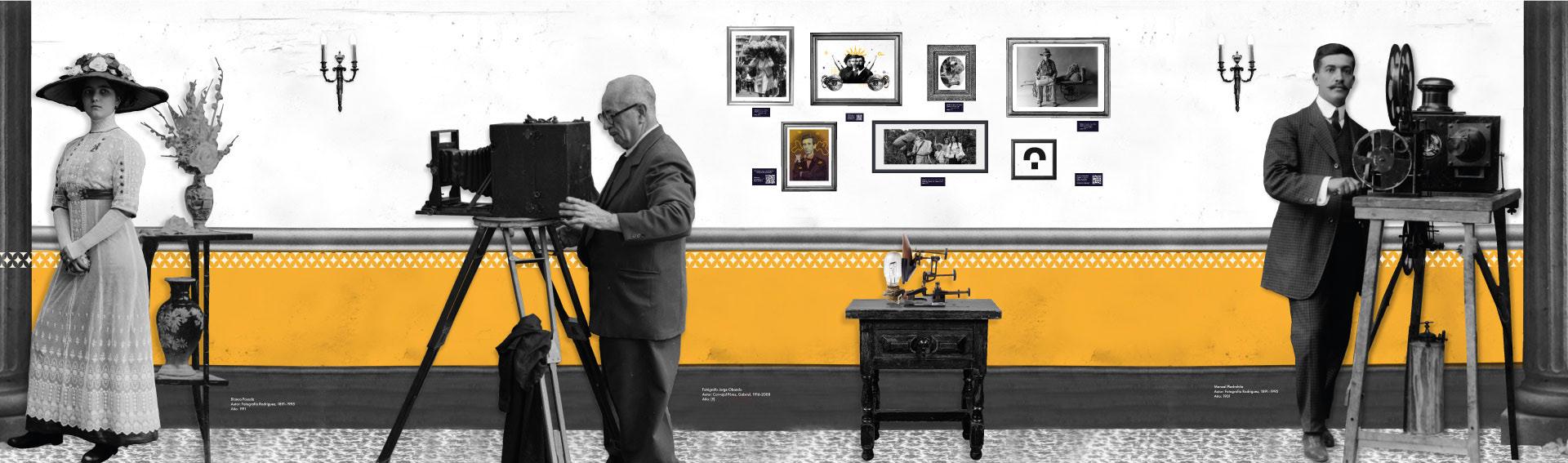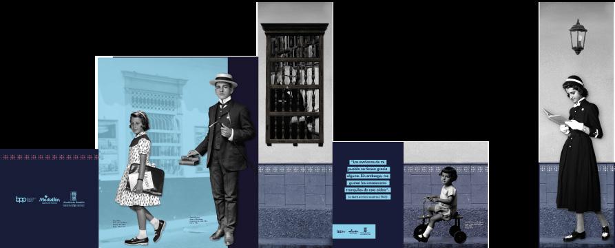 Para la identidad gráfica se combinaron imágenes del archivo fotográfico de la BPP, creando collages que se acompañaron con patrones en vectores para generar los zócalos y Pop ups en mdf para generar relieves en los espacios.