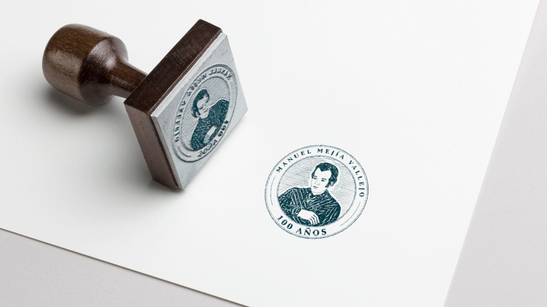 Creación del sello para el centenario del escritor antioqueño Manuel Mejía Vallejo. El resultado es una pieza gráfica con significado especifico y cumple como objeto de identificación.