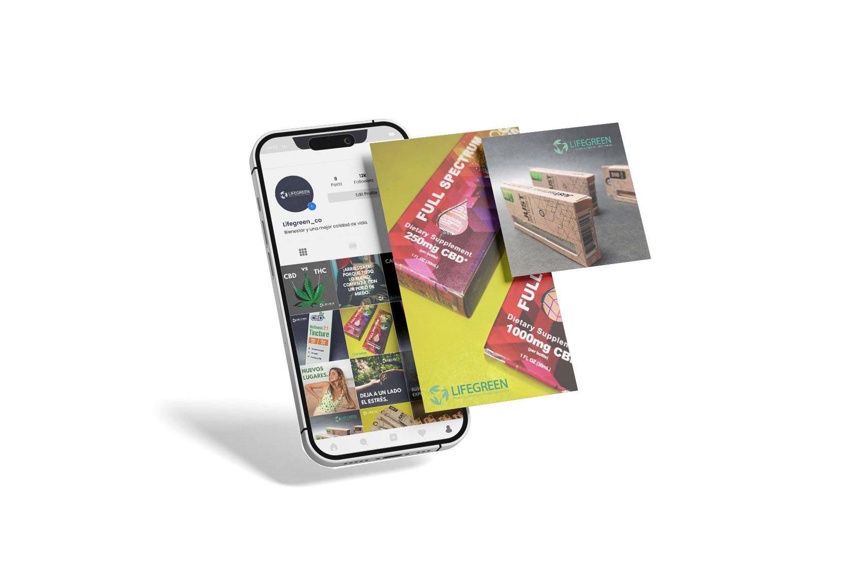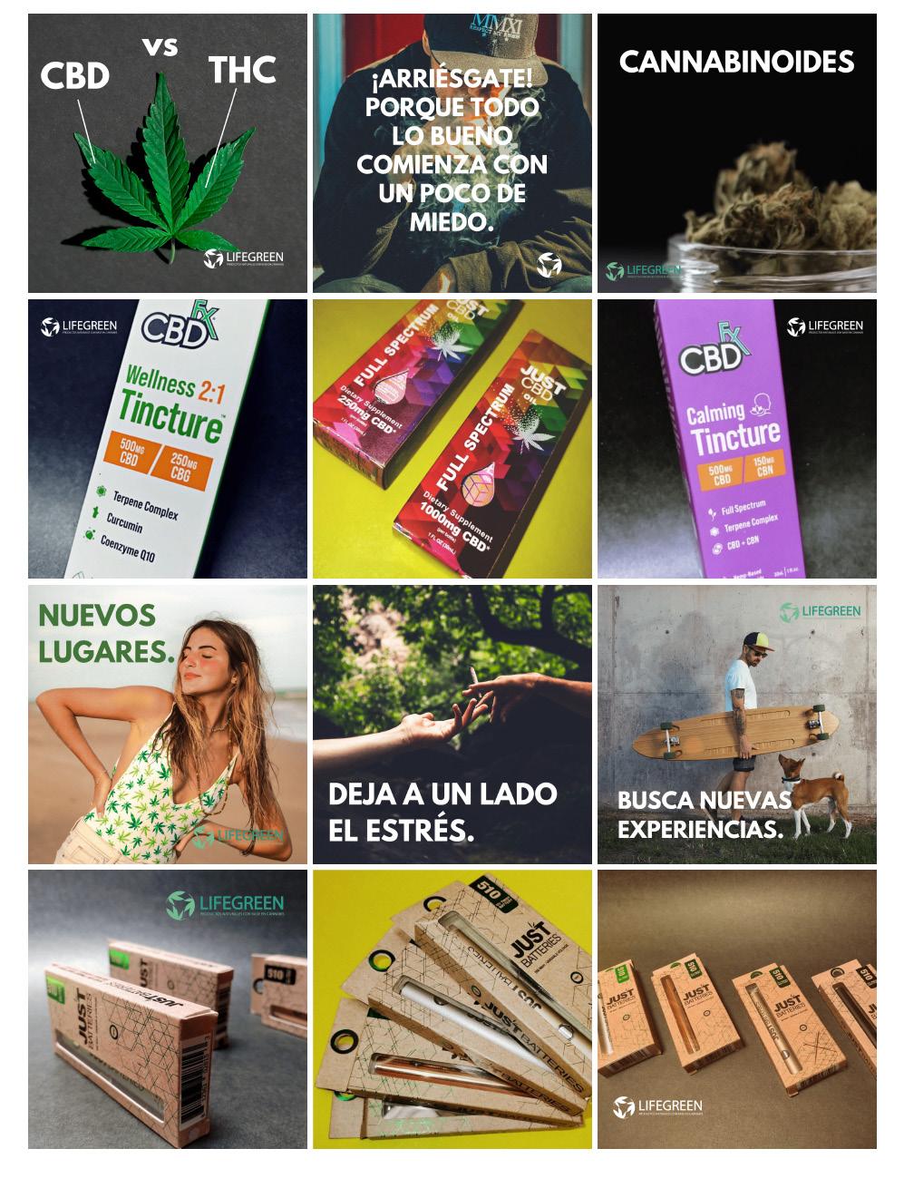 Ejercicio de diseño y creación de parrilla de contenidos. Se realiza el diseño de piezas gráficas para marca de cannabis medicinal, creando un mosaico atractivo para el feed de instragram.