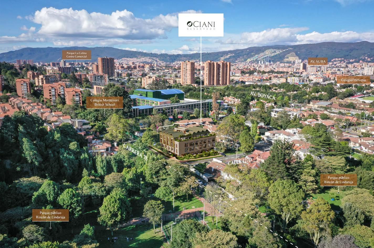 Al aprovechar la topografía del terreno y el diseño del proyecto, Ciani Reservado ofrece una vista fabulosa a la ciudad, integrando el entorno urbano como parte esencial de la experiencia de habitar los inmuebles superiores y disfrutar la terraza comunal. Los balcones y terrazas estratégicamente ubicados permiten que la luz natural inunde los interiores, al tiempo que brindan panorámicas espectaculares del horizonte oriental bogotano.