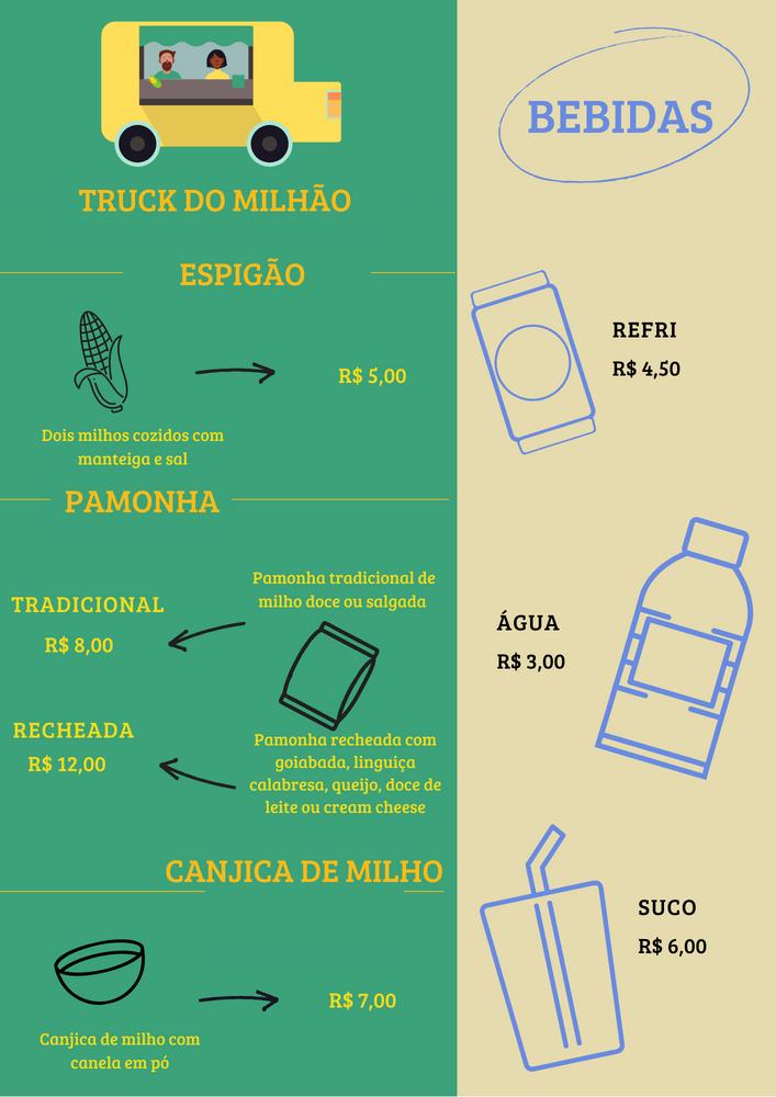 A partir disso, avançamos para um foodtruck de festa junina que venderia pratos típicos derivados do milho, com o diferencial de pamonhas recheadas.