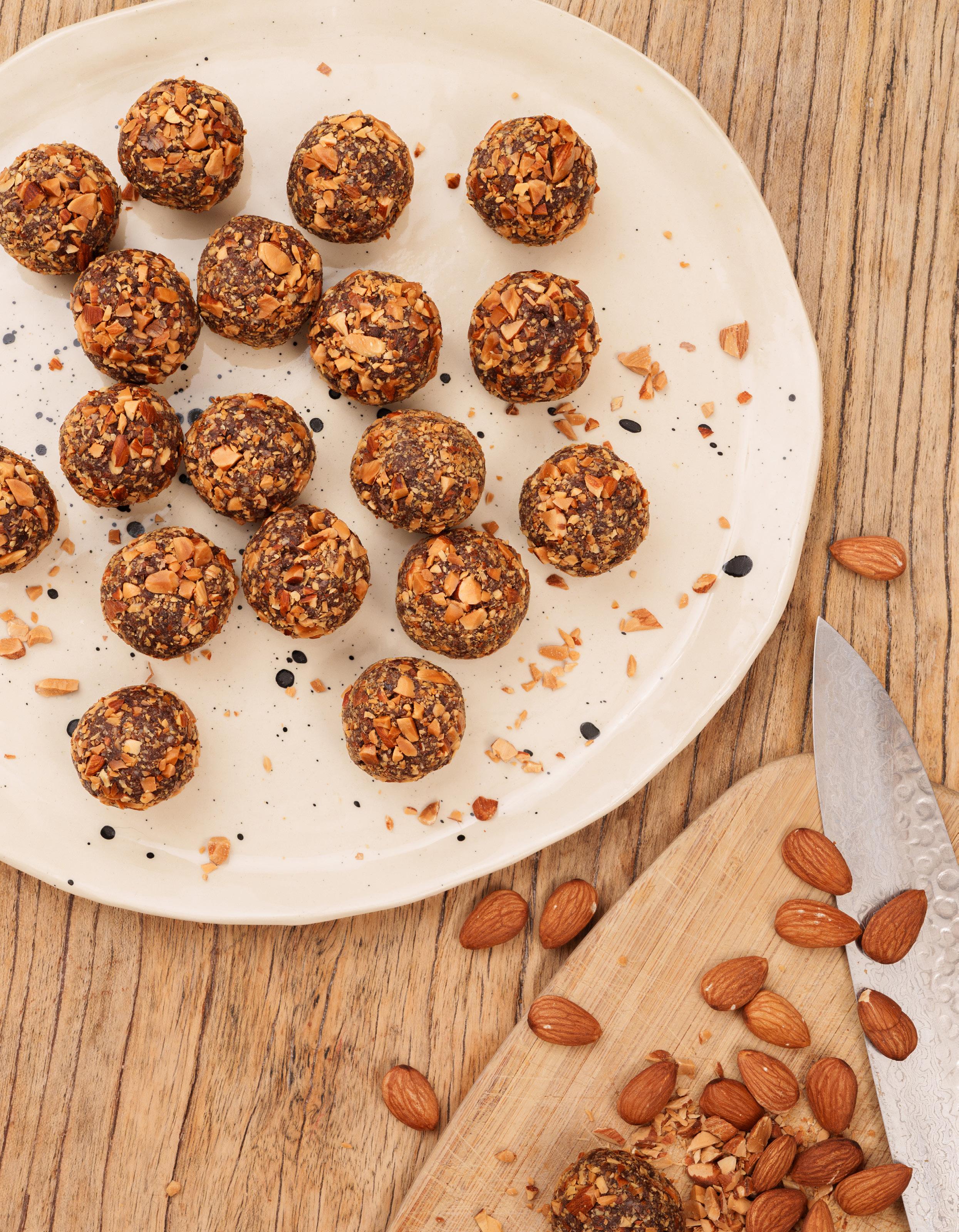 I love these when I need a little pep me up in the morning or in the middle of the day and want to avoid junk food. The dates provide a natural sweetness, almonds a toasty crunch and the coffee a lovely hint of bitterness. If you like them chewy, just keep adding almond meal to the mix until you have the texture you want, but make sure it’s still sticky enough to roll into balls.