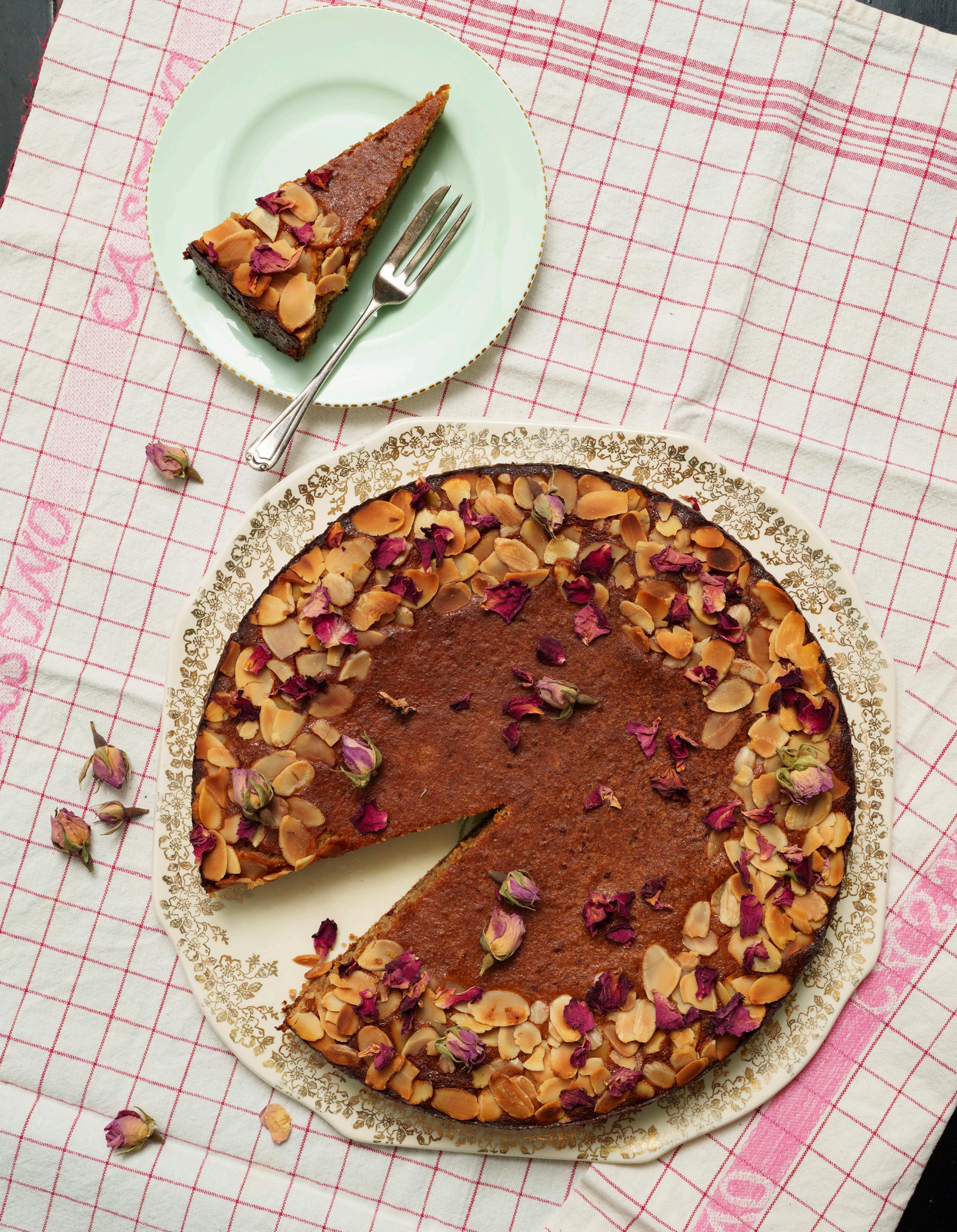 To make the cake batter, add the eggs, yoghurt, salt, cardamom, rosewater and saffron to the remaining crumb mixture. Whisk until smooth, pour over the crumb base, then sprinkle the flaked almonds over the top. Bake for about 20 minutes, until golden and fully risen – you will know because the top will probably crack a little. If the top is colouring too quickly, cover with foil and bake for a further 20 minutes. The centre of the cake should spring back when gently pressed. Cool completely before removing from the tin and cutting to serve.