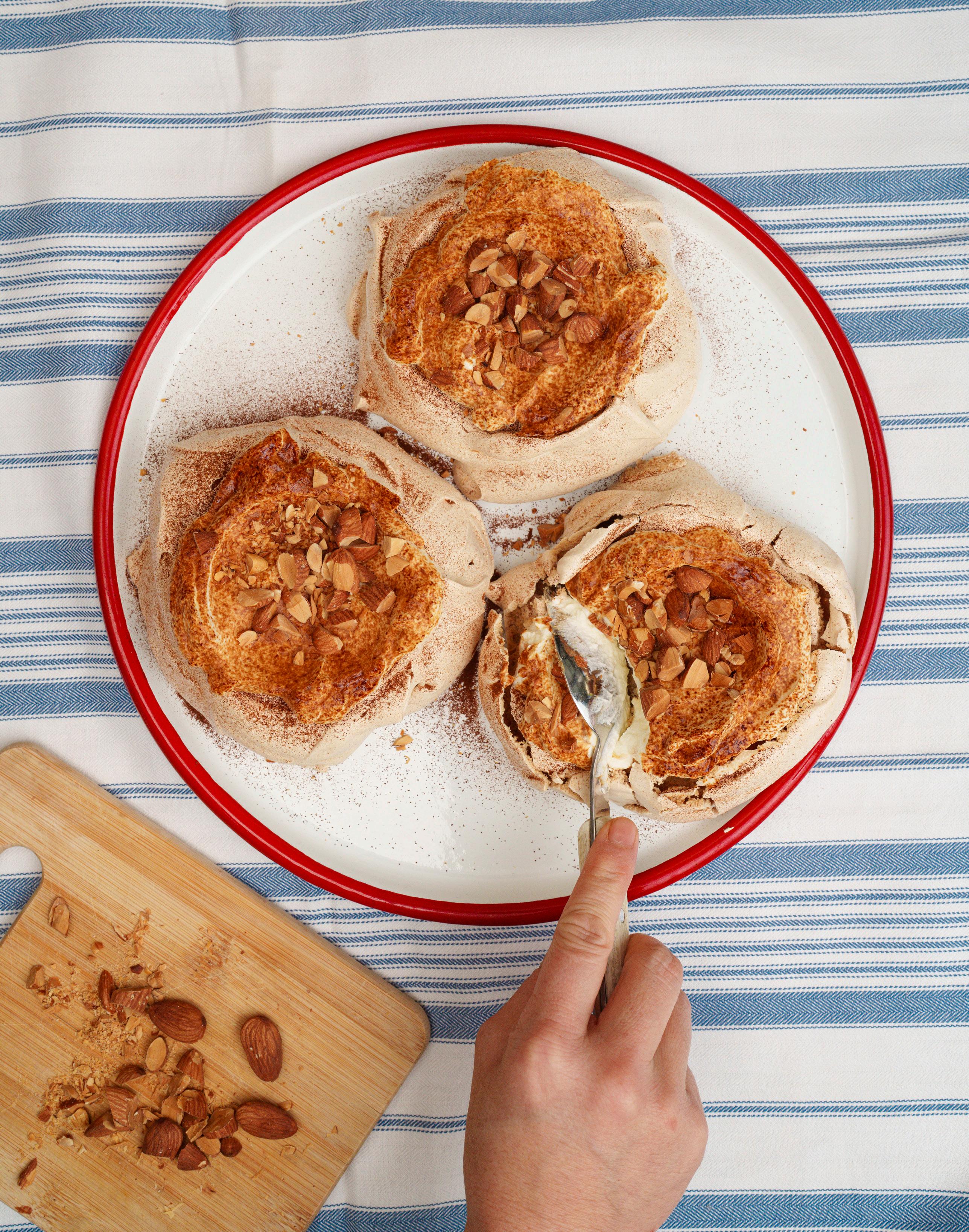 The combo of crisp, coffee meringue shell on the outside, chewy on the inside, topped with lashings of vanilla cream and a sprinkle of chunky, chopped, roasted almonds couldn’t be less fancy, yet still to die for!