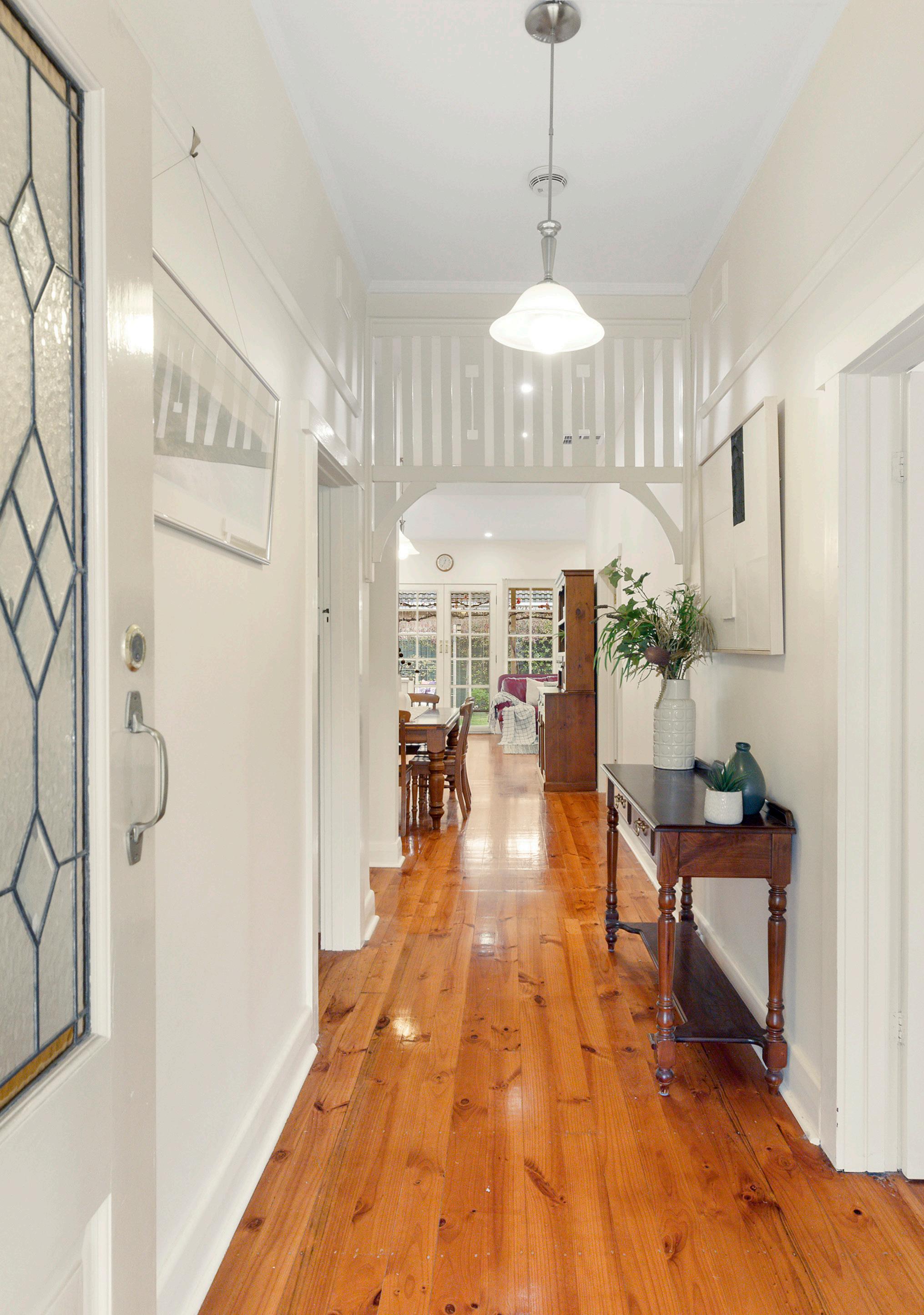 A beautiful wide entry is lined with polished timber floors and all the character details including ornate ceilings and fretwork.