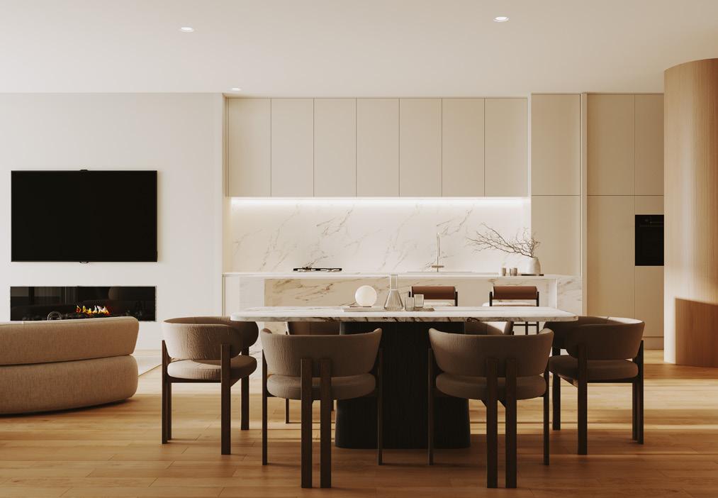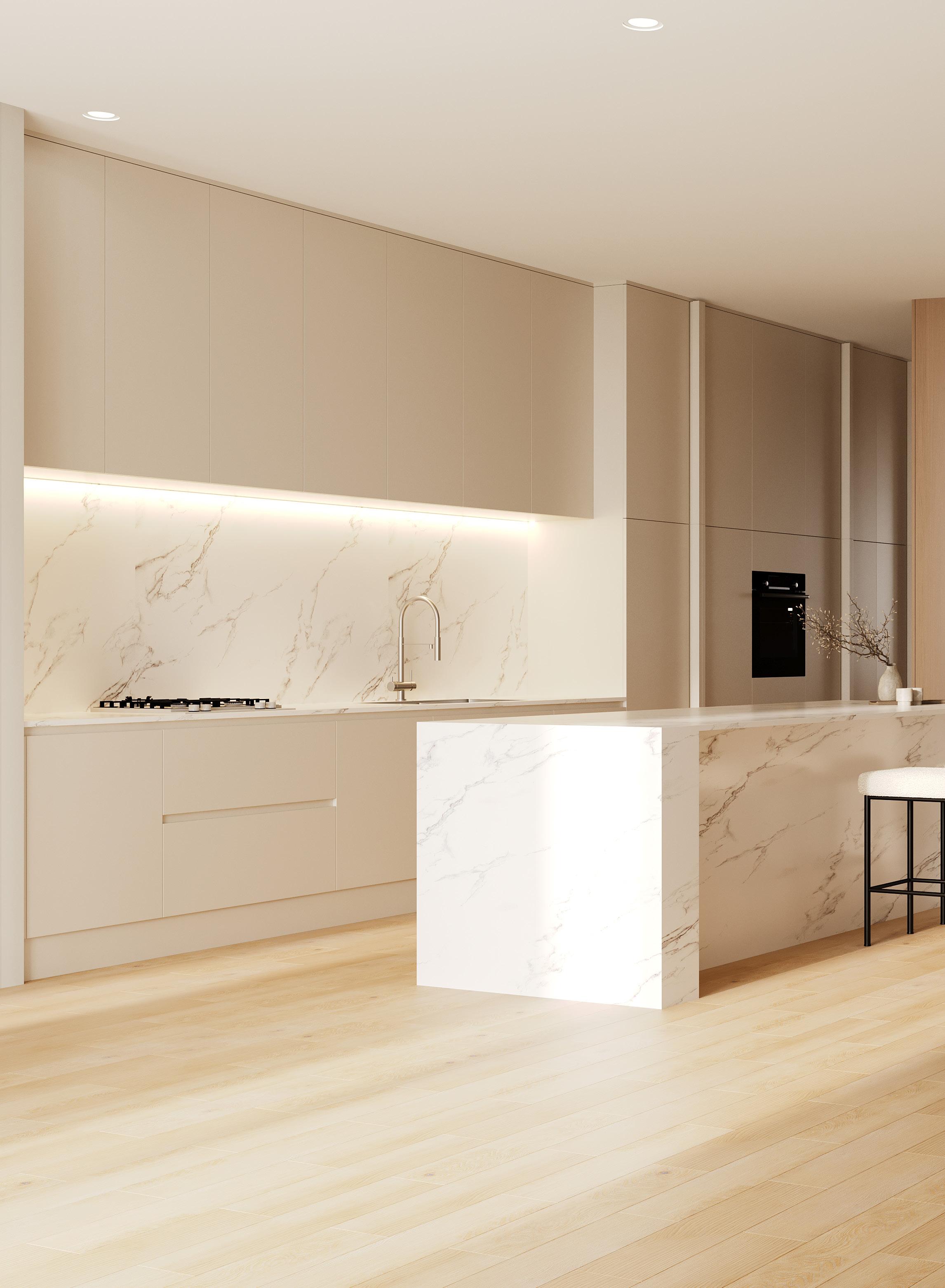 A testament to understated elegance, Solstice’s thoughtfully curated facade reflects exceptional craftsmanship and enduring quality. Featuring textural render and sleek, contemporary bronze, the monochromatic palette offers a sophisticated design aesthetic that complements Seacliff’s timeless architectural character, fostering a deep connection to place.