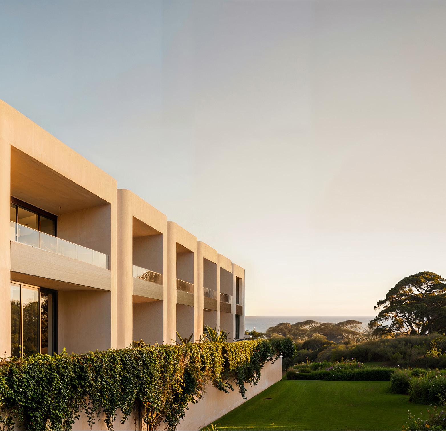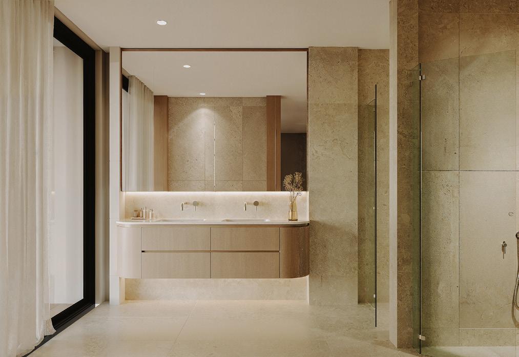 At once robust, tactile and visually captivating, Solstice’s architectural design brings a refined aesthetic to this coveted beachside locale. Reflecting the essence of Seacliff, the facades present a modern interpretation of the iconic coastal surrounds, characterised by a palette of elegant, organic and robust materials. Featuring a striking curved form and strong sense of symmetry, the buildings are thoughtfully designed to settle seamlessly within their elevated surroundings. Full-height glazing provides residents with an abundance of natural light whilst allowing breathtaking views of the ocean. Meticulously curated outdoor spaces seamlessly integrate with the facade’s wellarticulated design, creating a serene atmosphere and elevated living experience.