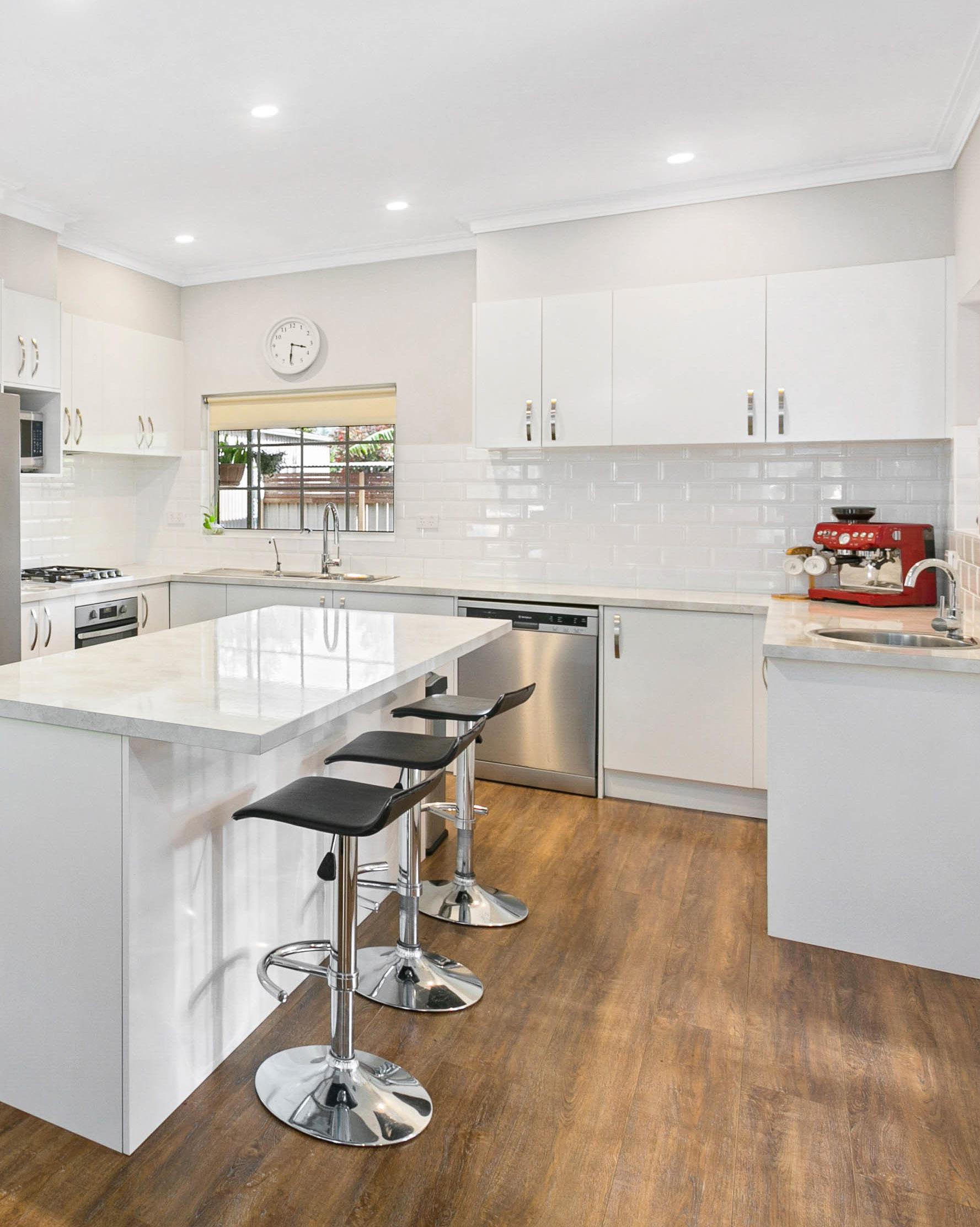 Renovated with feeding families in mind, the sophisticated white kitchen offers plenty of room for helping hands; a huge island bench with breakfast bar the focal point around which infinite bench and cupboard space, a double sink, dishwasher and gas cooktop will make many mealtime memories.