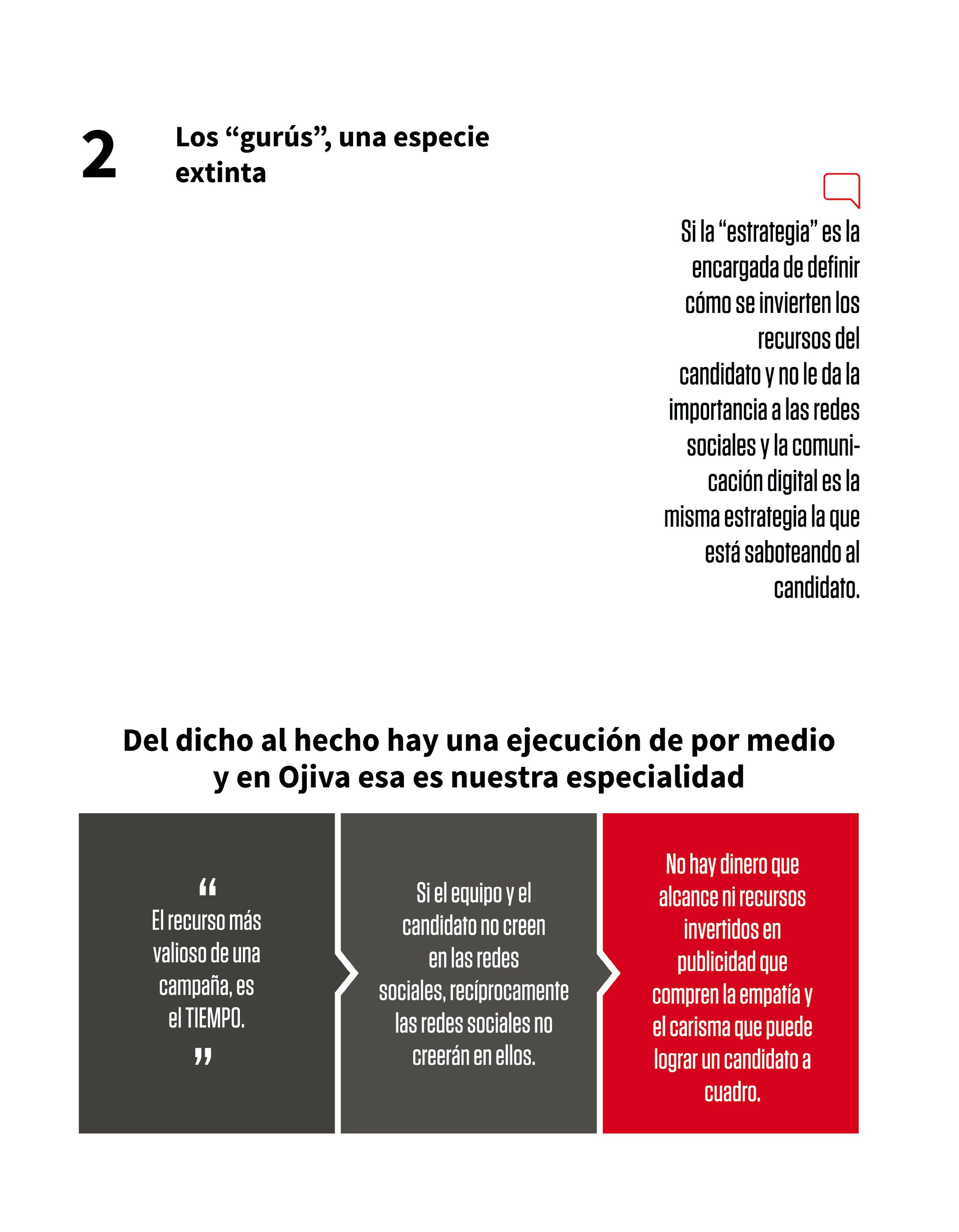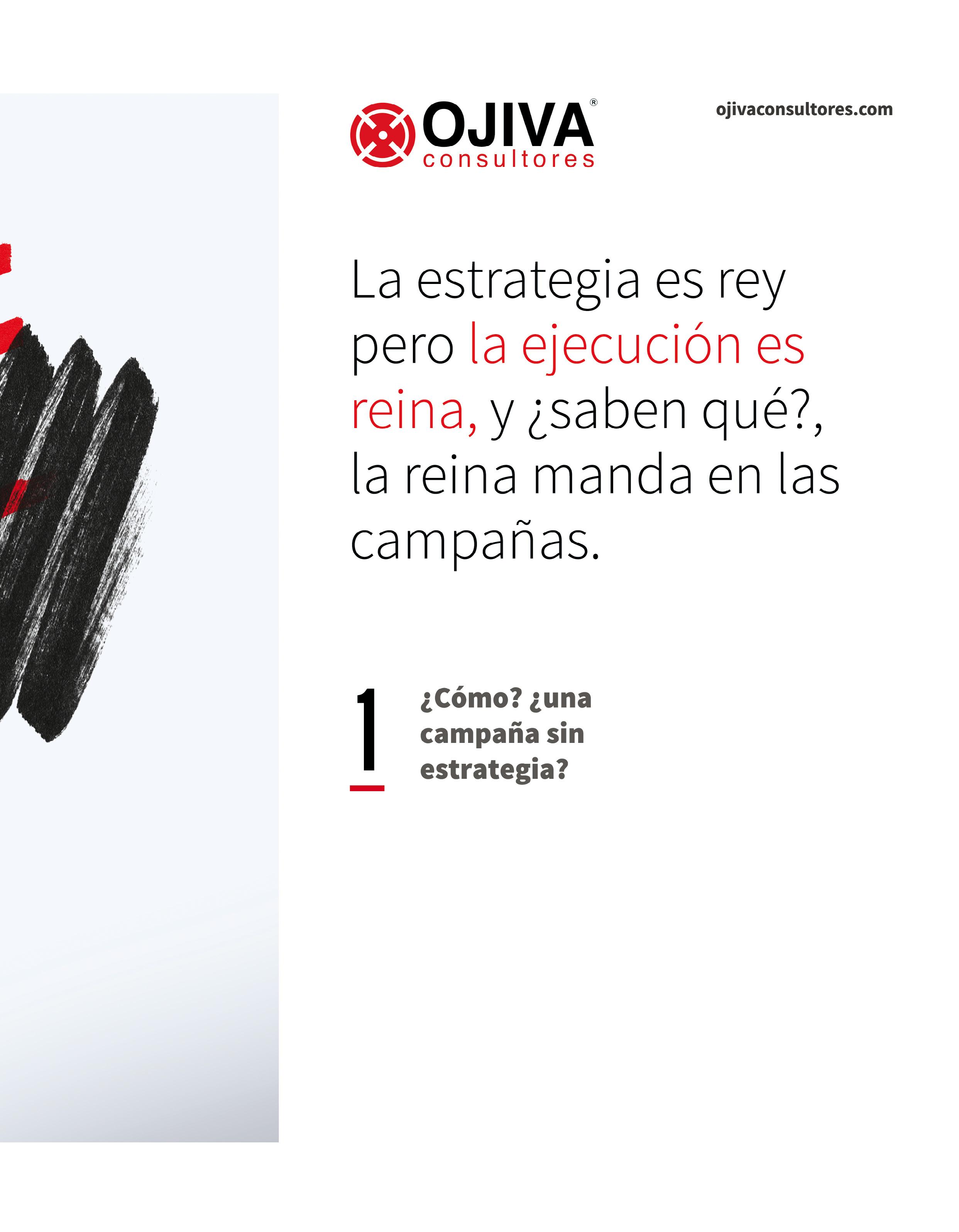 Es responsabilidad de la estrategia, de los publicistas y de las agencias digitales generar estos momentos “mágicos” que logren empatía con los electores y se traduzcan en votos. En Ojiva no solo proponemos, también escribimos, producimos, editamos, diseñamos, publicamos, pautamos y nos encargamos de que todos los elementos de ejecución estén puestos. Si tu estratega no lo está haciendo, o tú, colega, no lo estás haciendo, piénsatelo dos veces. Los medios y formatos para lograr un gran contenido viral y eficiente electoralmente son infinitos. Cuando el cliente pone el objetivo, el estratega digital se encarga de crear el camino, y su misión es decirle qué hacer, por qué hacerlo, cómo hacerlo y acompañarle hasta la meta.