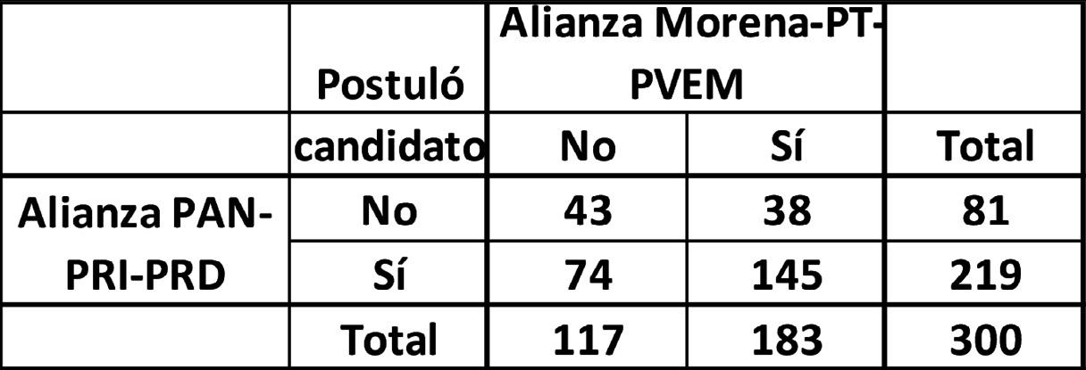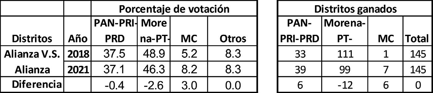 Para este 2021, la alianza PAN-PRI-PRD se formó en 219 distritos electorales, mientras que la de Morena-PT-PVEM en 183. De aquí que coincidieron estas dos alianzas en 145 distritos, en 74 solamente se formó la primera coalición, en 38 sólo se formó la segunda y Cuadro 1 Votación para diputado federal por partido (%)