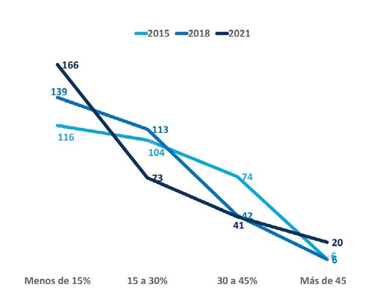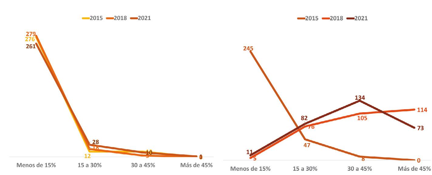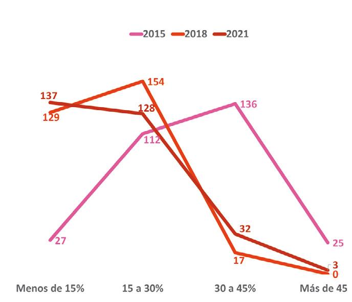 Si bien los porcentajes de votación de los principales partidos en 2021 fueron similares a los del 2018, la estructura del voto por distrito cambió, el PAN aumentó el número de distritos donde captó más de 45% del voto, pero también tuvo un crecimiento significativo en el número de distritos donde tuvo menos de quince por ciento de los sufragios, el voto panista dejó de ser nacional para volverse regional ya que en 55% de los distritos prácticamente su presencia desapareció (ver gráfica 1). Aunque en menor medida, el PRI que también tuvo un pequeño incremento en el número de distritos donde su presencia fue prácticamente nula, pasó de tener 129 distritos con menos de quince por ciento de la votación en 2018 a 137 en 2021, y a la vez mejoró su presencia en distritos donde tuvo más de 30% de la votación distrital (ver gráfica 2).