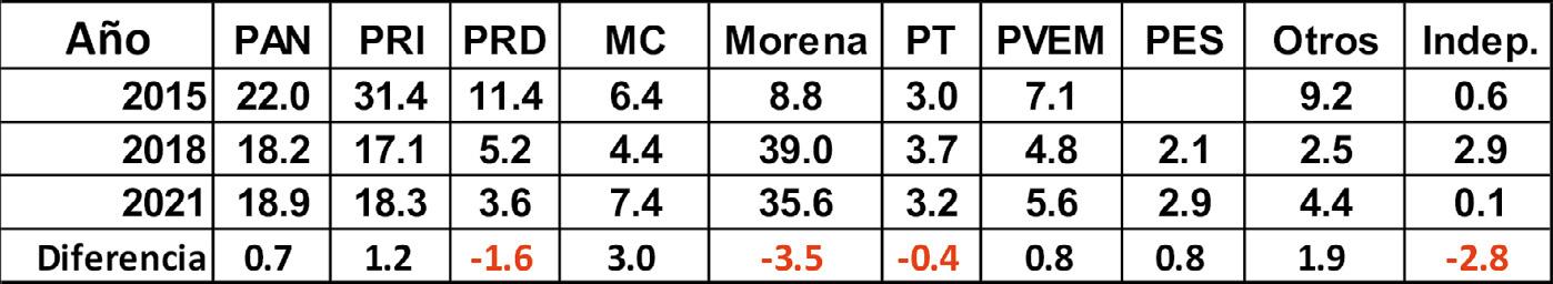 presentaron un cambio mayor a tres puntos porcentuales que para el primero significó un crecimiento de 68% mientras que para el segundo una caída de 8.9%, el PRD tuvo una caída mayor a 30% en el voto obtenido en 2021 (ver cuadro 1).