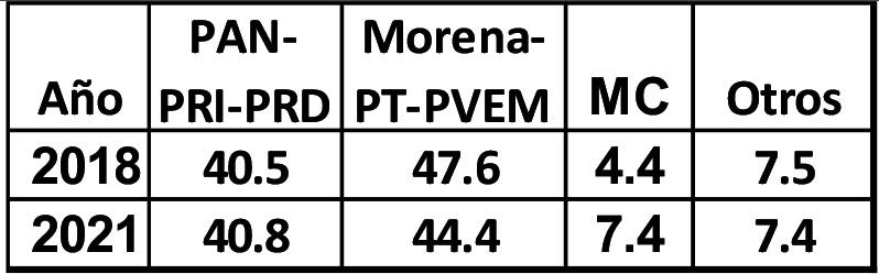 Dado que las alianzas electorales han sido diferentes desde 2015, tenemos primero que tener el voto de cada partido para poder reagruparlo en alianzas. Prácticamente el voto fue muy similar en las dos últimas elecciones, solo Movimiento Ciudadano (MC) y Morena