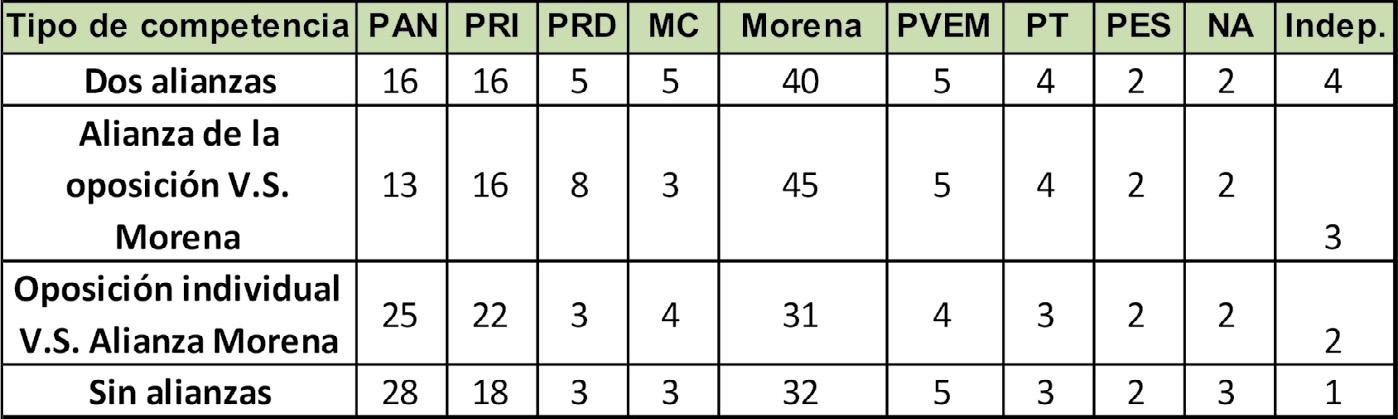 Así podemos agrupar el voto de los partidos en cuatro categorías dependiendo del tipo de competitividad: a) Choque de alianzas, aquellos 145 distritos federales donde se enfrentaron los dos tipos de alianzas; b) Alianza del PAN-PRI-PRD contra Morena como partido individual 74 distritos; c) Alianza Morena-PT-PVEM contra los partidos individuales de oposición 38 distritos y, d) No se formó ninguna alianza y todos los partidos compitieron de manera individual en 43 distritos. Los datos para analizar no solamente toman en cuenta el porcentaje de votación sino el triunfo de las alianzas en esos distritos comparado contra un hipotético comportamiento realizado en la elección del 2018.