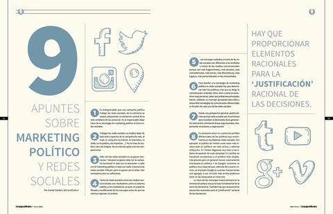 Es necesario tener en cuenta los perfiles diferenciales de los públicos que encontramos en las distintas redes sociales. Por ejemplo: el público de Twitter suele estar más involucrado en política, ser más activo y además influyente. En Twitter llegamos muy bien a los líderes de opinión de cada sociedad. En cambio en Facebook accedemos a un público más amplio, más grande pero en general menos masivamente interesado en política. Y en Google+ tenemos un público muy especial que, además del usuario común, es el propio Google (y cuantas más personas nos agregan a sus círculos más arriba podemos estar en las búsquedas en internet). La clave de los mensajes estará siempre en lo emocional porque esa es la base fundamental de la toma de decisiones. También hay que proporcionar elementos racionales para la ‘justificación’ racional de las decisiones.